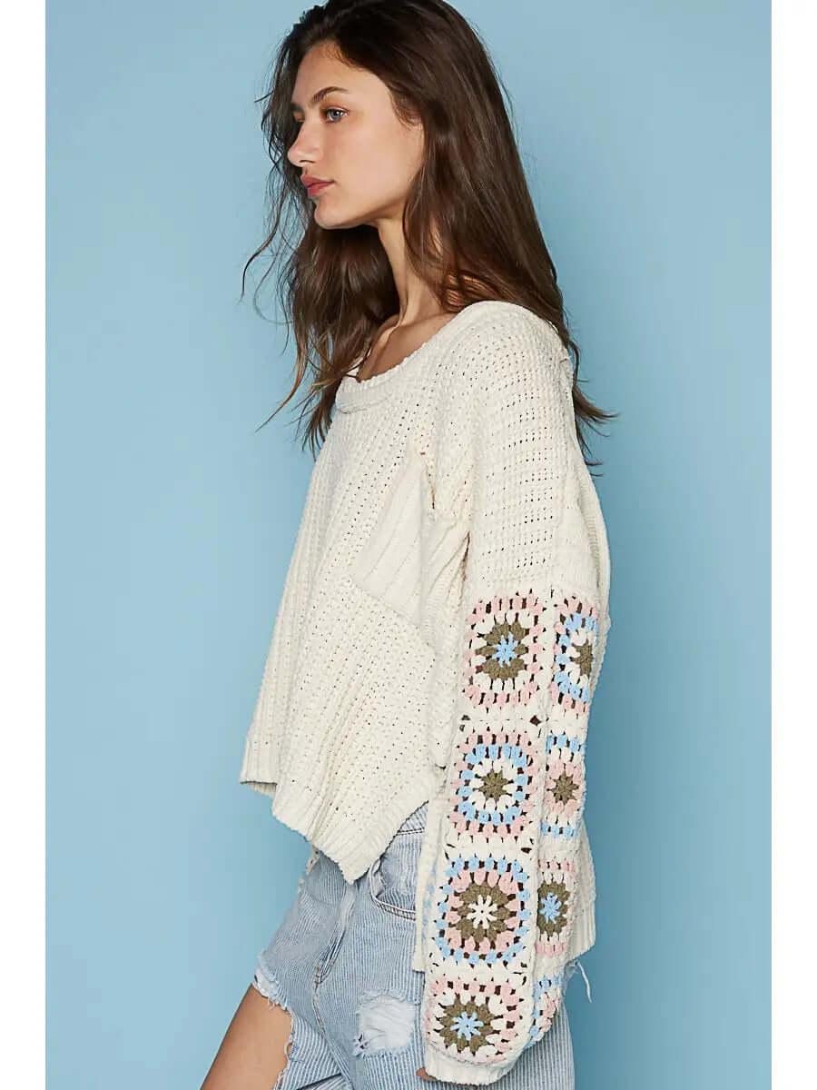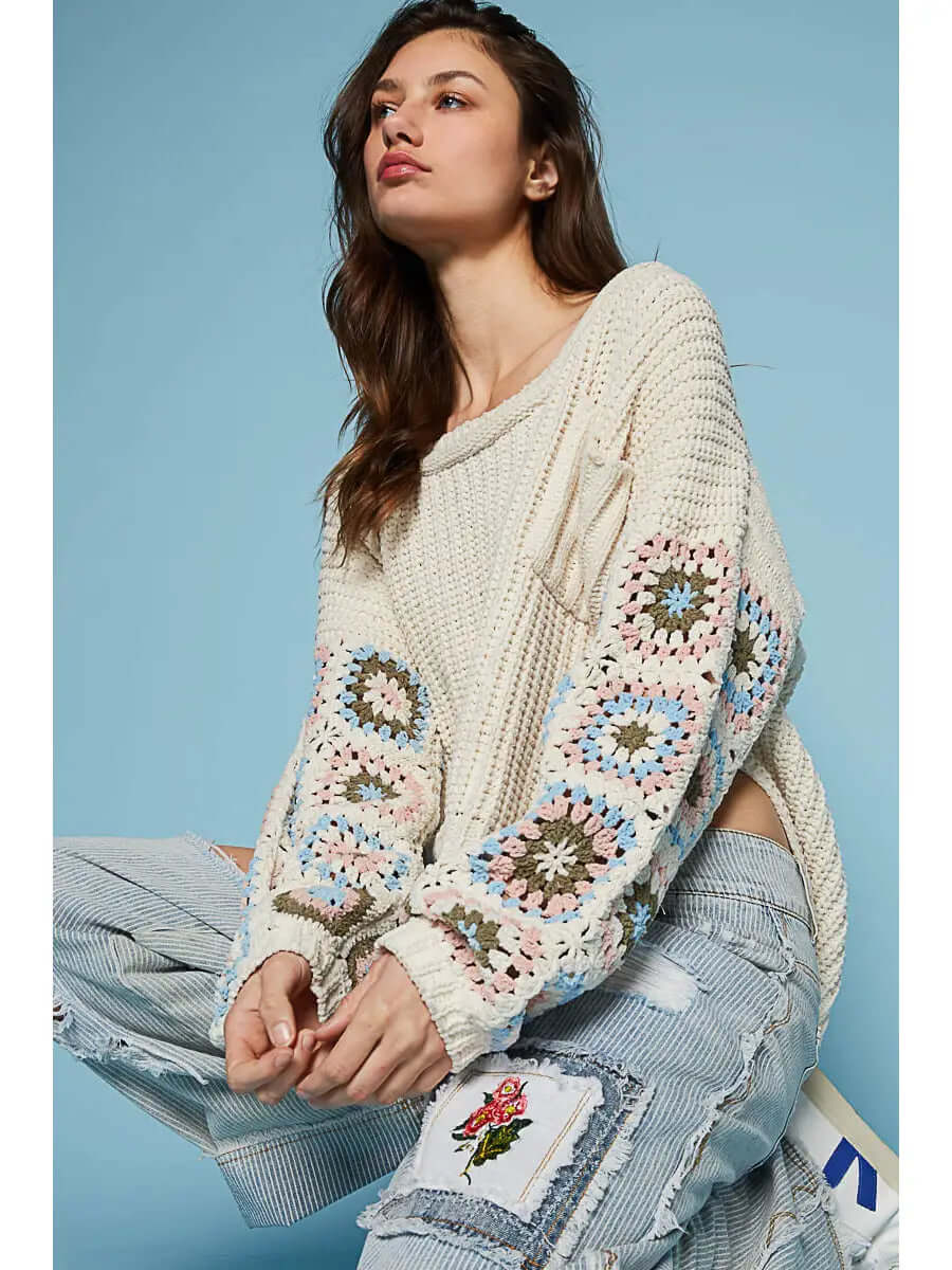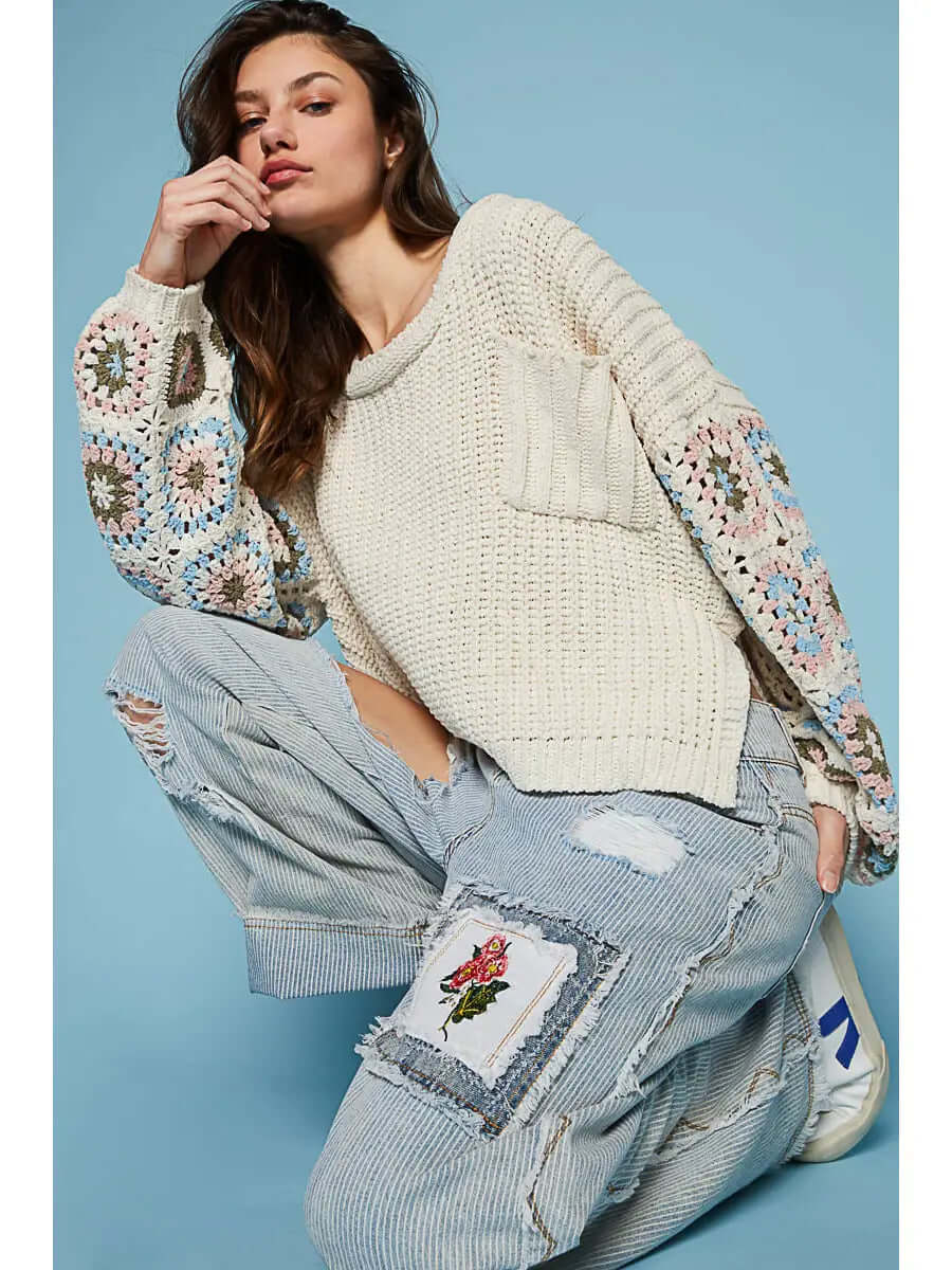 Designed in a oversize fit, round neck, pocket front, side open slit, hand knit granny square pattern long sleeves, yarn cable knit, chenille pullover sweater. Specs/Dimensions: - Please call or message our team for more info.
