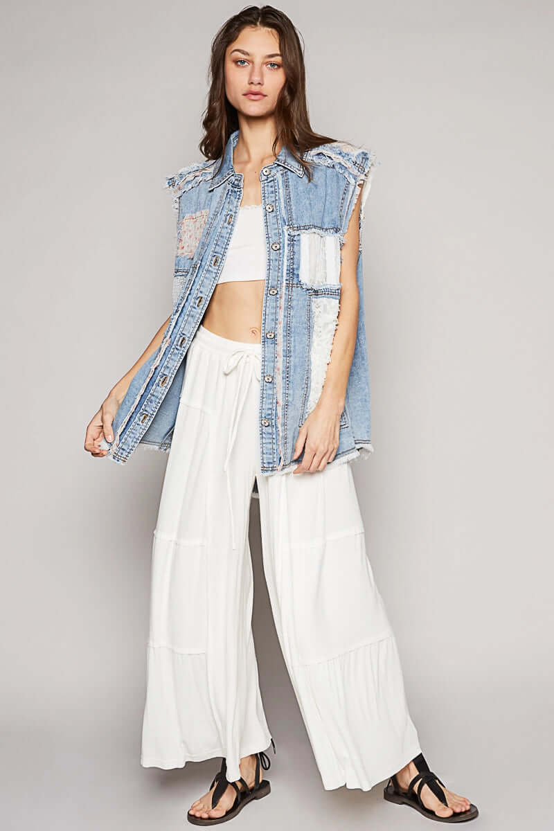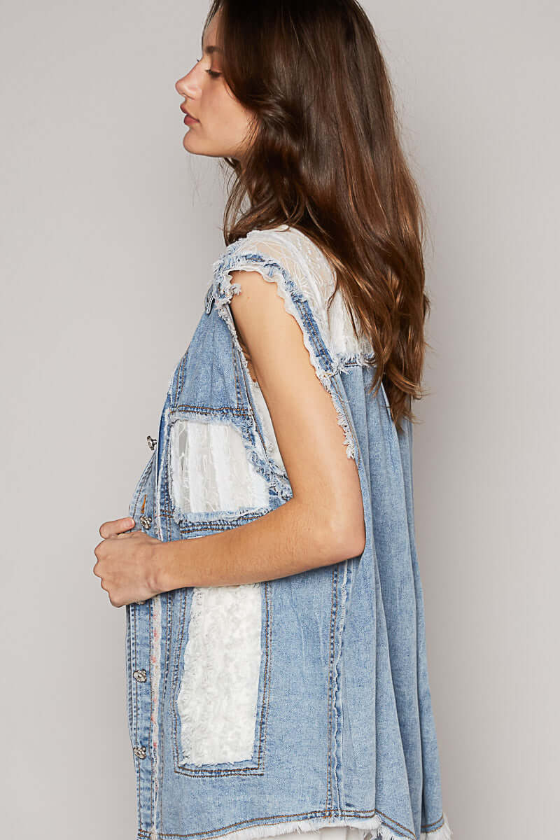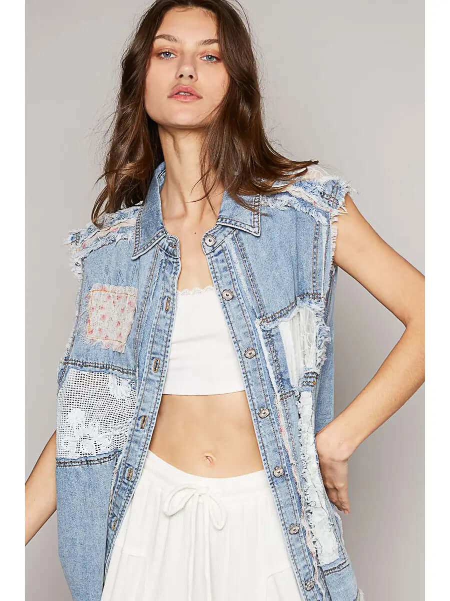 Sleeveless Crochet Lace Floral Patch Denim Vest