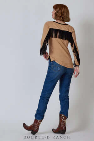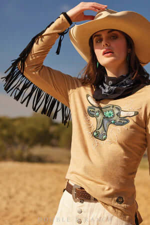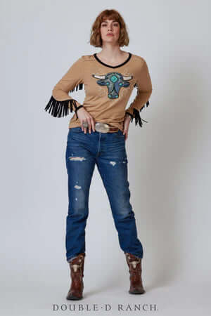 This tee takes it up a notch. The camel-colored cotton top is emblazoned with a colorful cow character, embellished with everything from embroidery to tonal turquoise studs. The crisp black contrast collar is complemented by everyone’s favorite finishing touch: fringe!