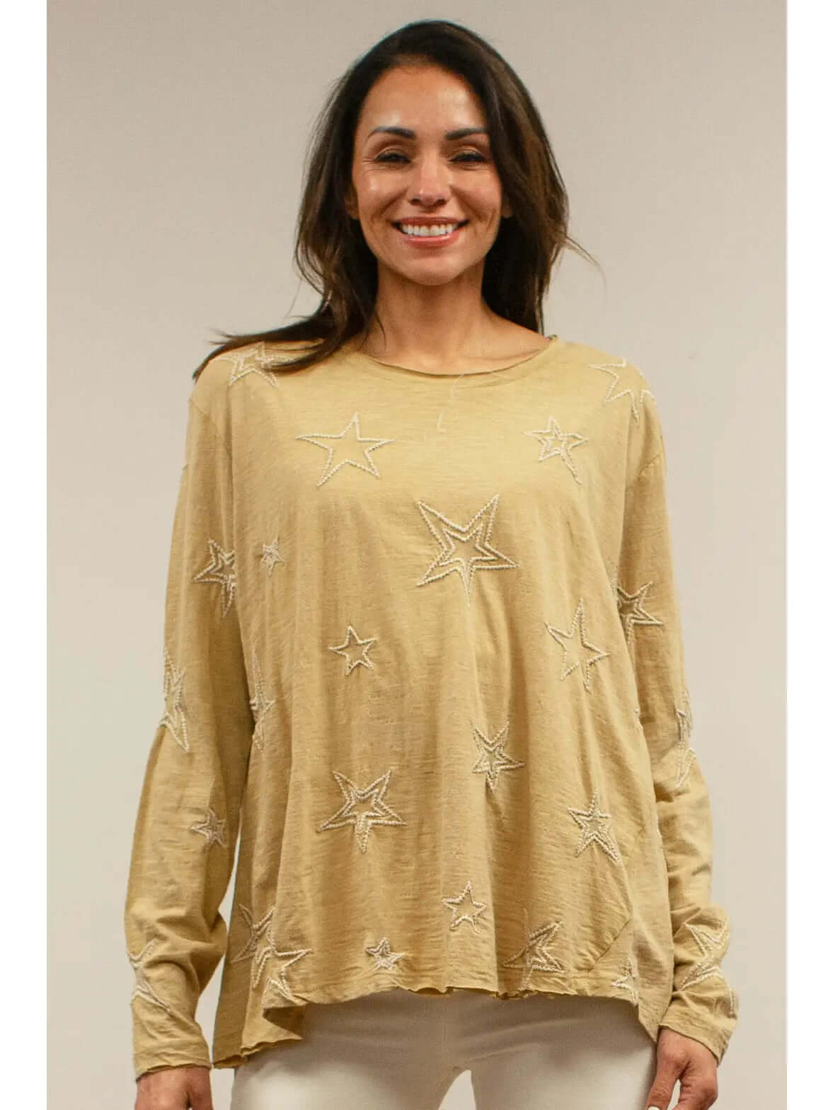 Long sleeve comfy tee accented with ivory embroidery stars all love this amazing top.