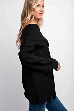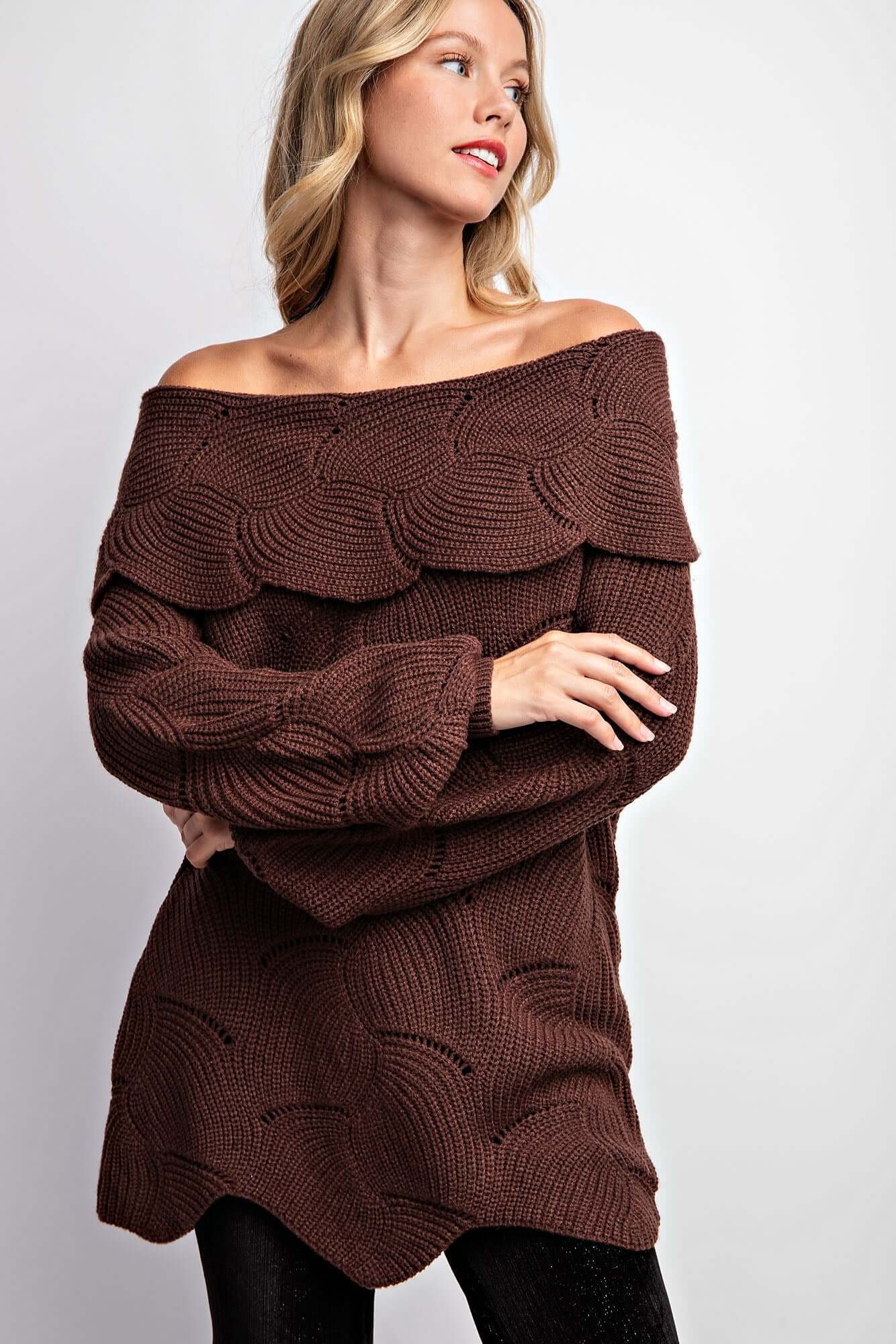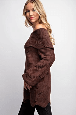 Fold over neckline sweater, long sleeve, off the shoulder, asymmetrical hem