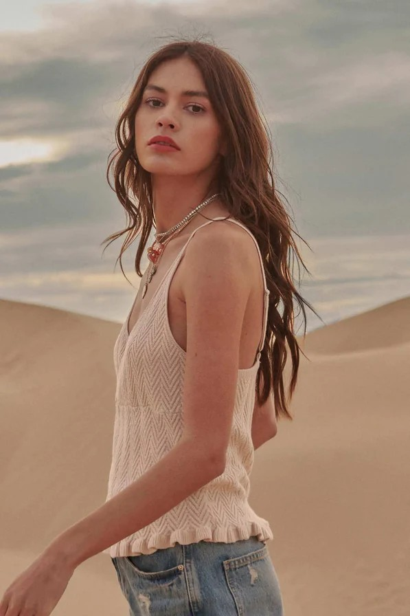 Tap into your adventurous side with this solid, knit cami top! With features like a surplice neckline and a ruffled hem, you'll be sure to make a bold statement. Not to mention, the low back and adjustable cami straps will have you feeling confident and daring. Don't miss out on a fitted silhouette that stands out from the crowd. Be ready to take on whatever comes your way in this versatile top!