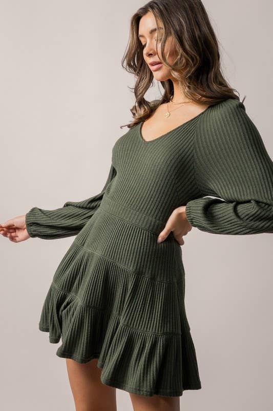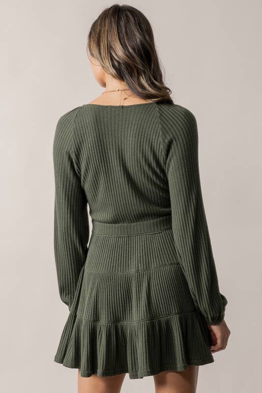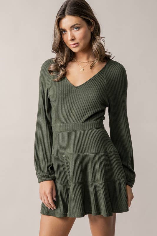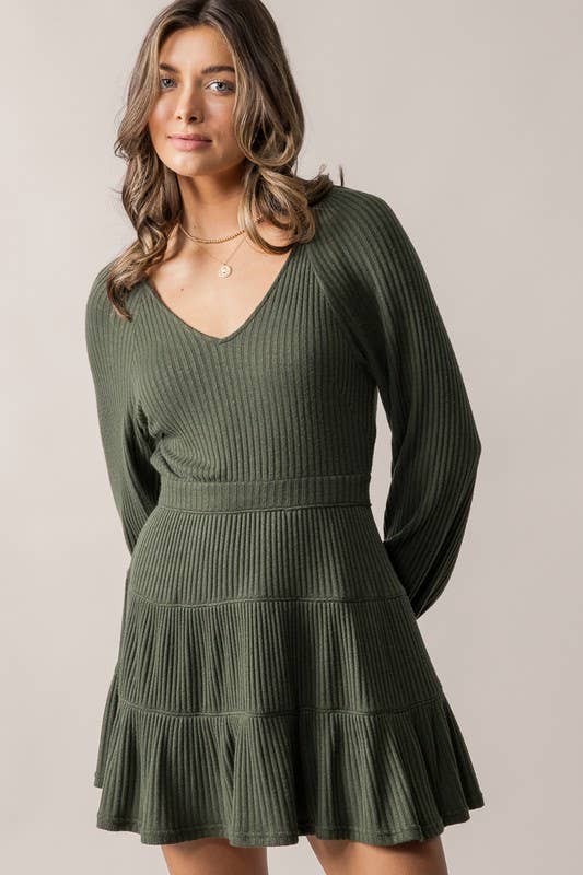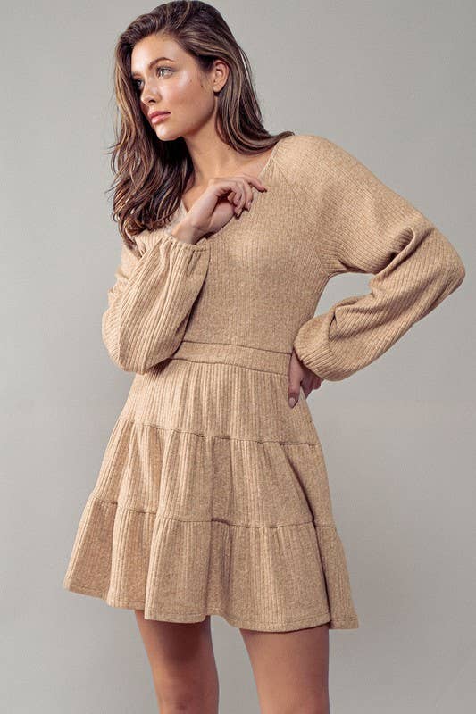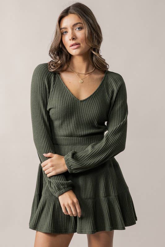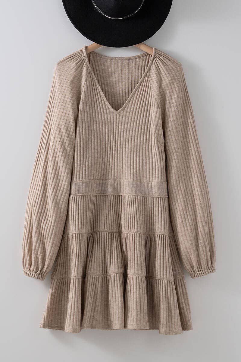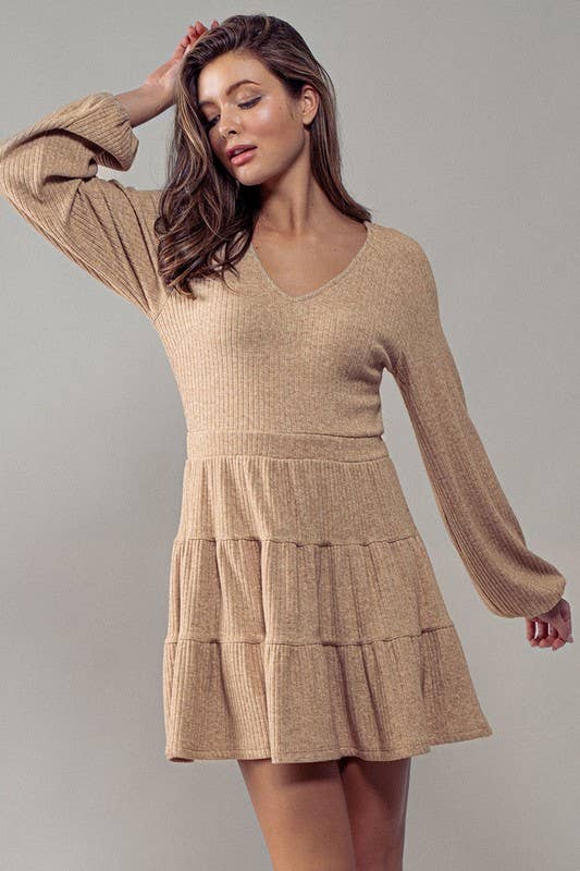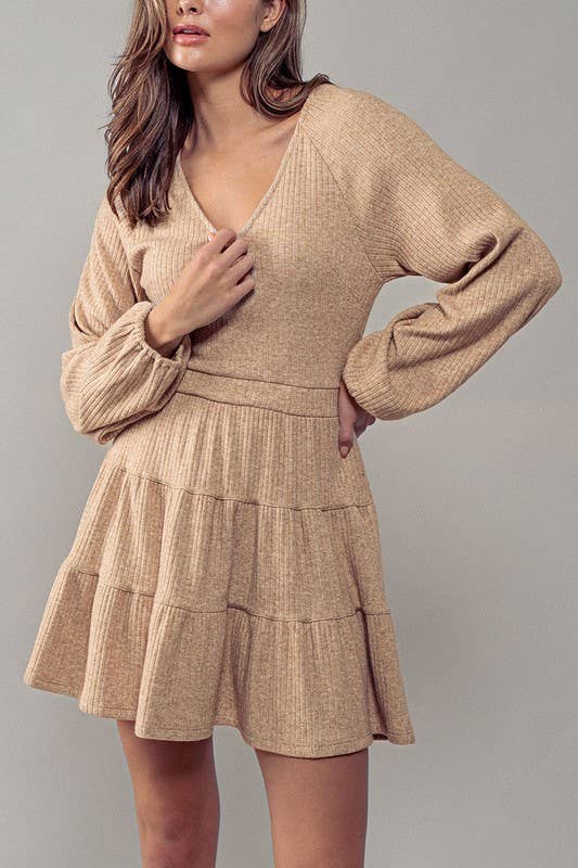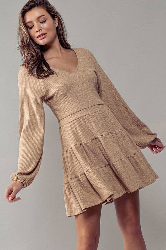This Deluxe Comfort Knit Mini Dress combines luxe cashmere softness with a playful ribbed texture for all-day coziness. Featuring a flattering V-neck and tiered skirt, it adds flirty movement to your look. The scrunched, durable long sleeve cuffs bring a touch of charm and keep you comfy from morning to night. Pair it with your favorite belt and western boots to create a fun, stylish outfit that’s perfect for any casual outing or a night on the town. Embrace comfort and style with this effortlessly chic mini dress!