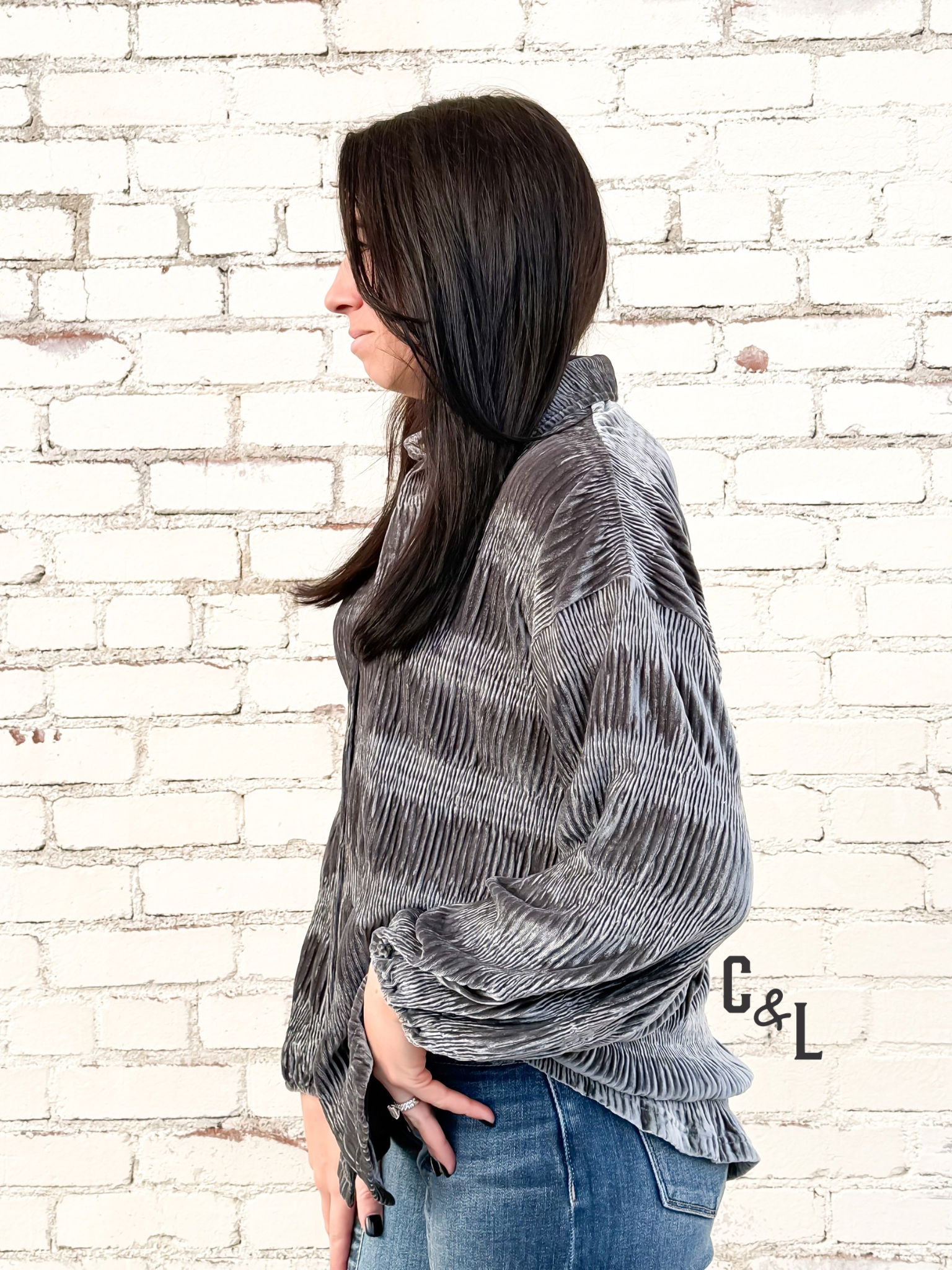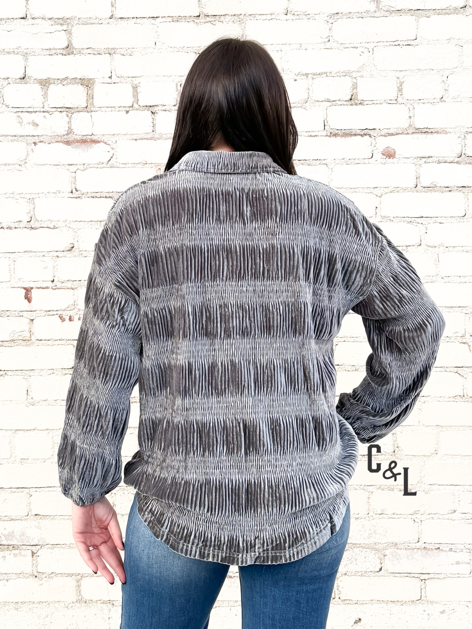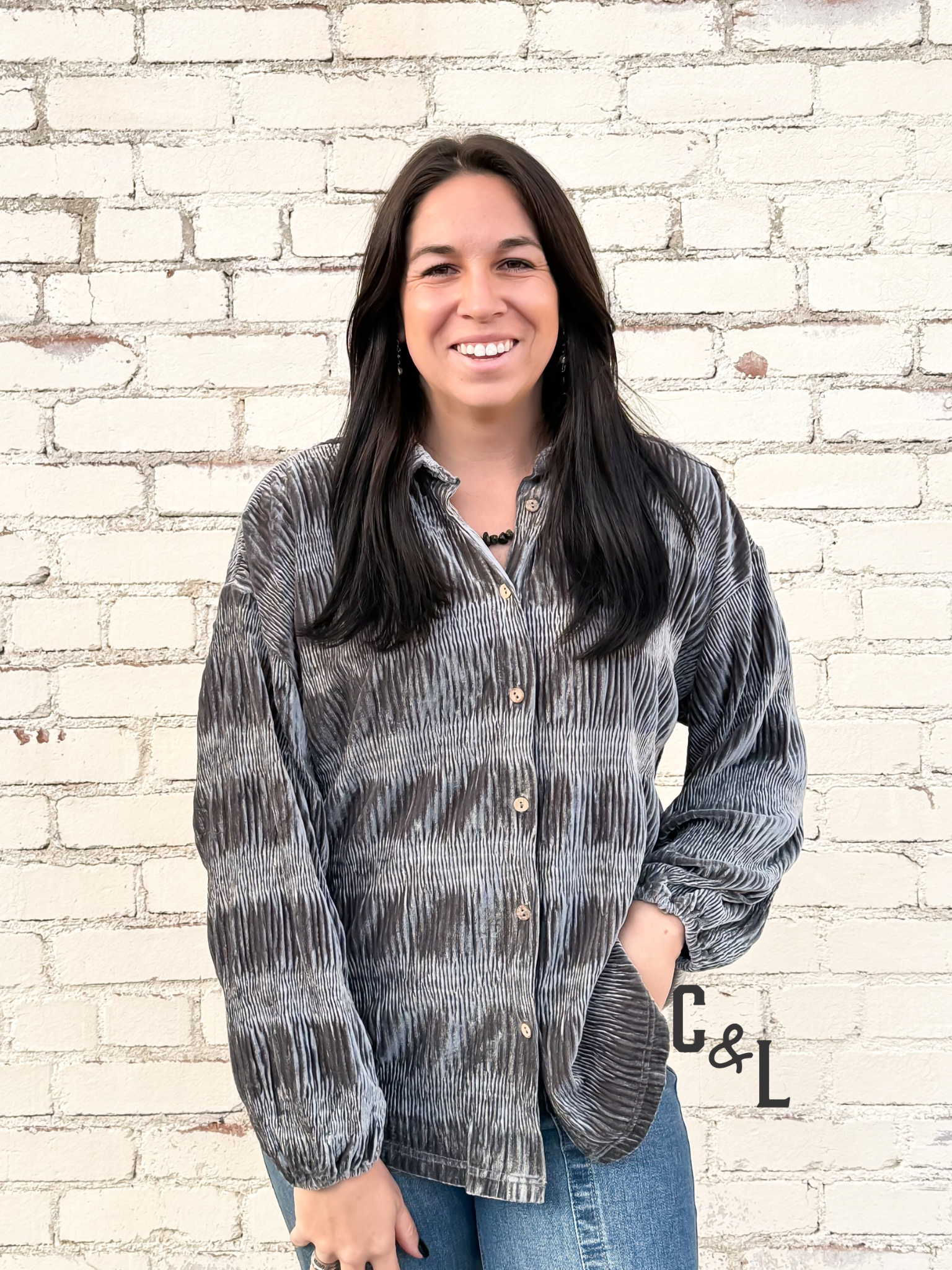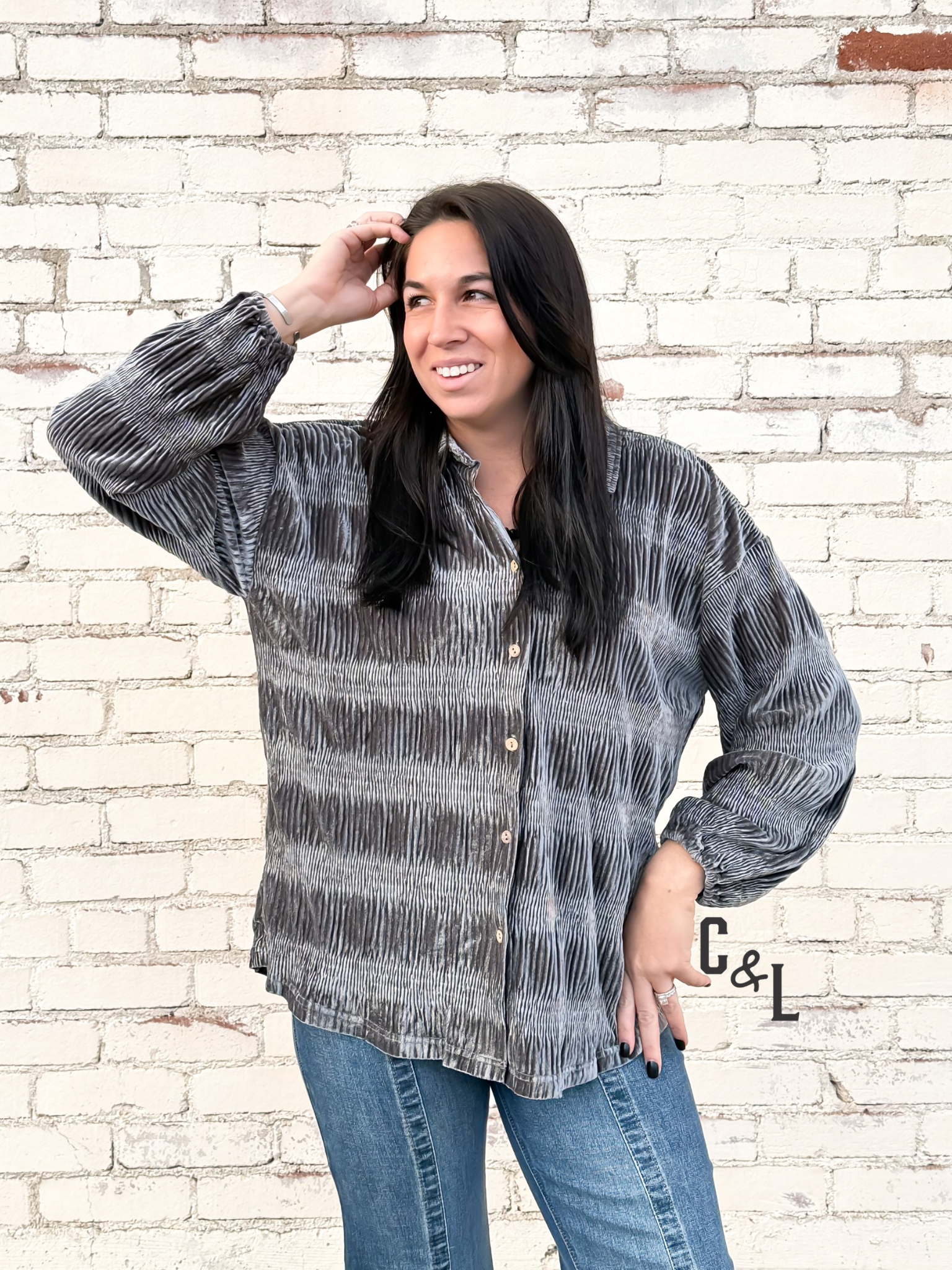 the Midnight Mesa Velvet Top — a luxe Copper & Lace piece that brings soft shimmer and sophisticated Western flair to your wardrobe. Crafted from rich gunmetal velvet, this tiered, gathered design features a flattering smocked bodice and gentle puff sleeves that create an effortlessly feminine silhouette.