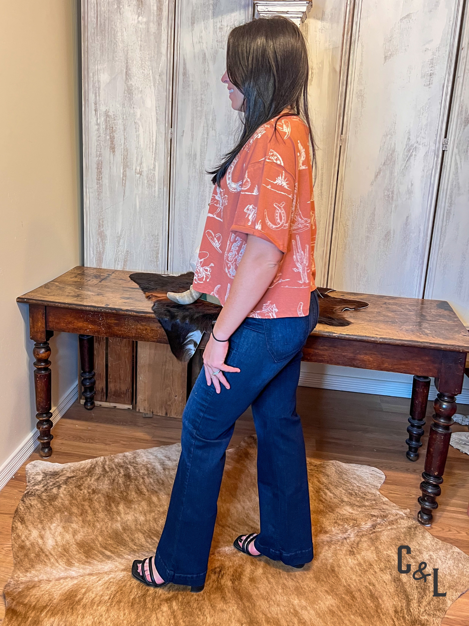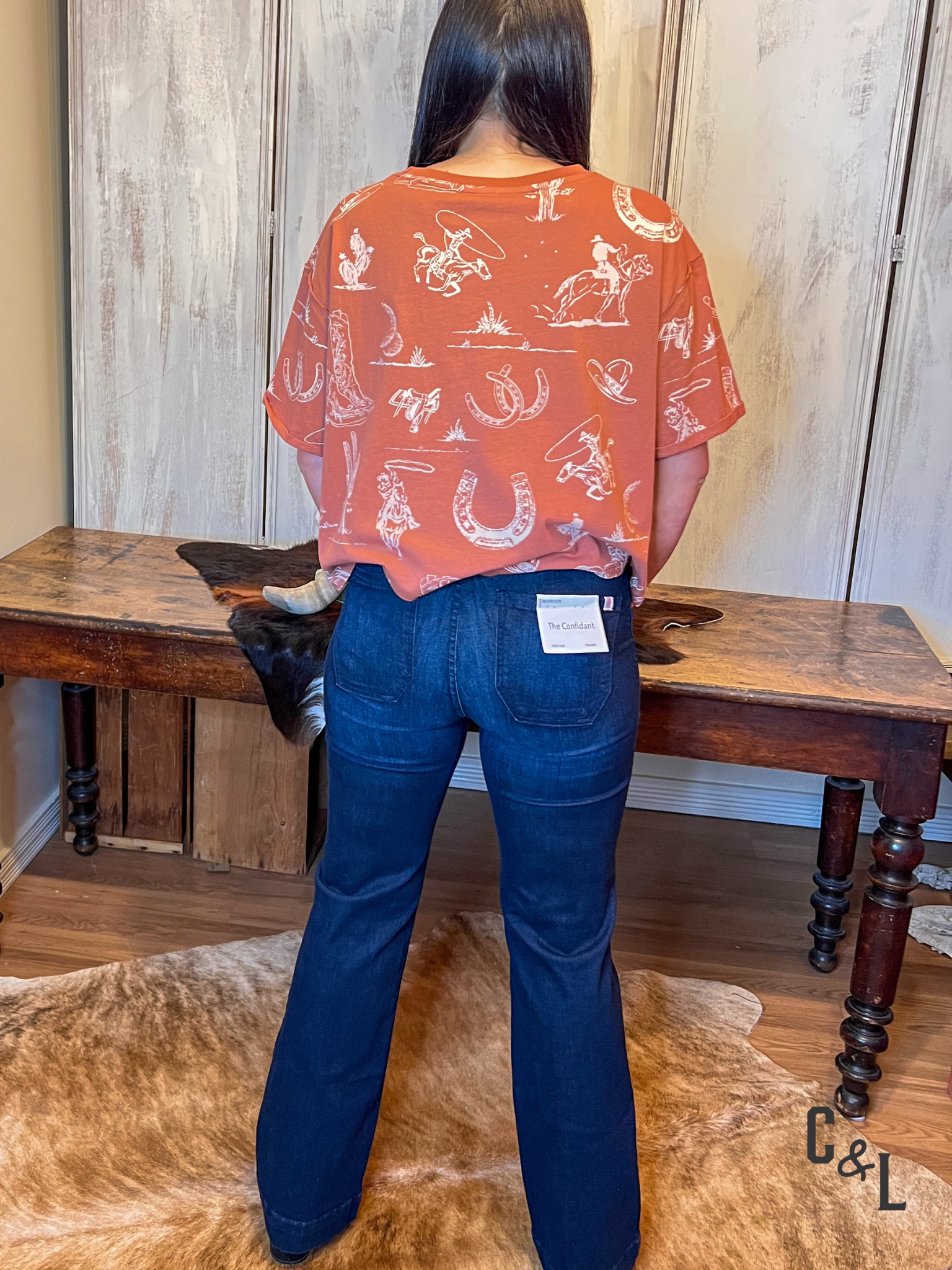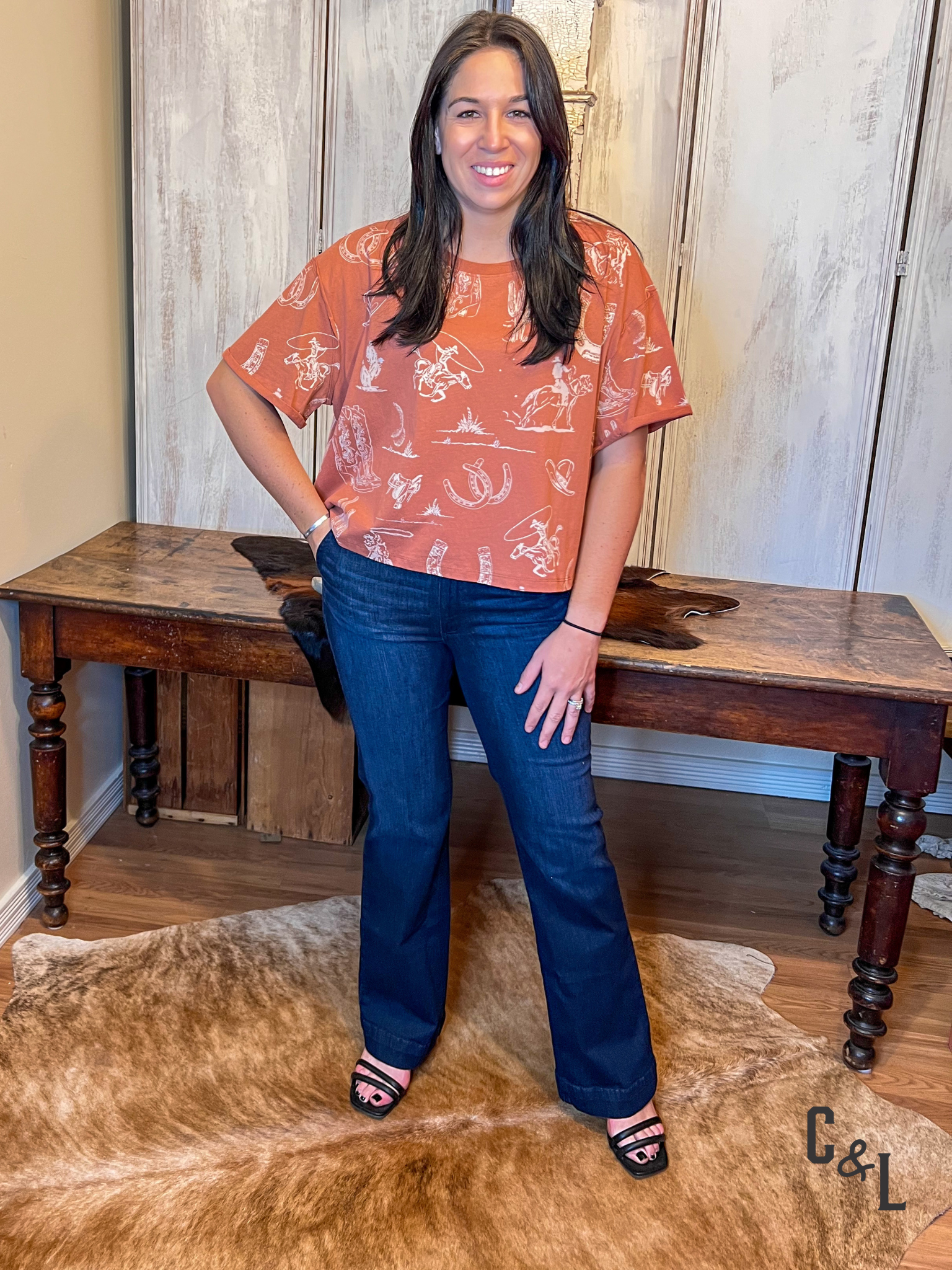 Meet your new go-to graphic: the Tess—a rust short-sleeve crop tee splashed with crisp white Western icons (cactus, boots, horseshoes, and a cowboy mid-rope). Soft, stretchy, and just the right length to hit at the waist, it pairs effortlessly with high-rise denim, skirts, or cutoffs.
