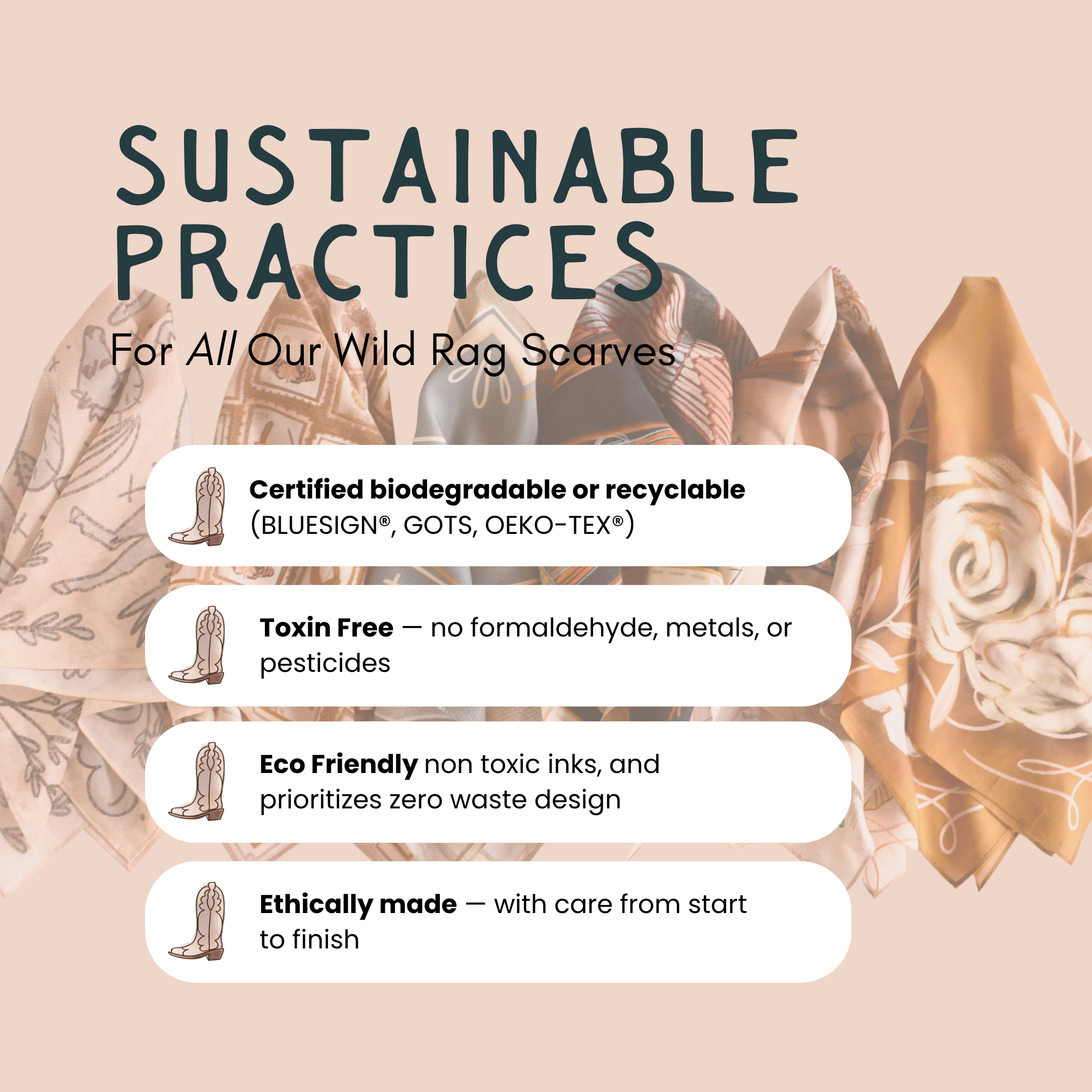 - What are your scarves and wild rags made from? We offer our Western scarves and wild rags in a variety of high-quality materials. You'll find options in genuine silk, soft cotton, and silk-like blends. The product description for each item provides specific details on its fabric content and feel.