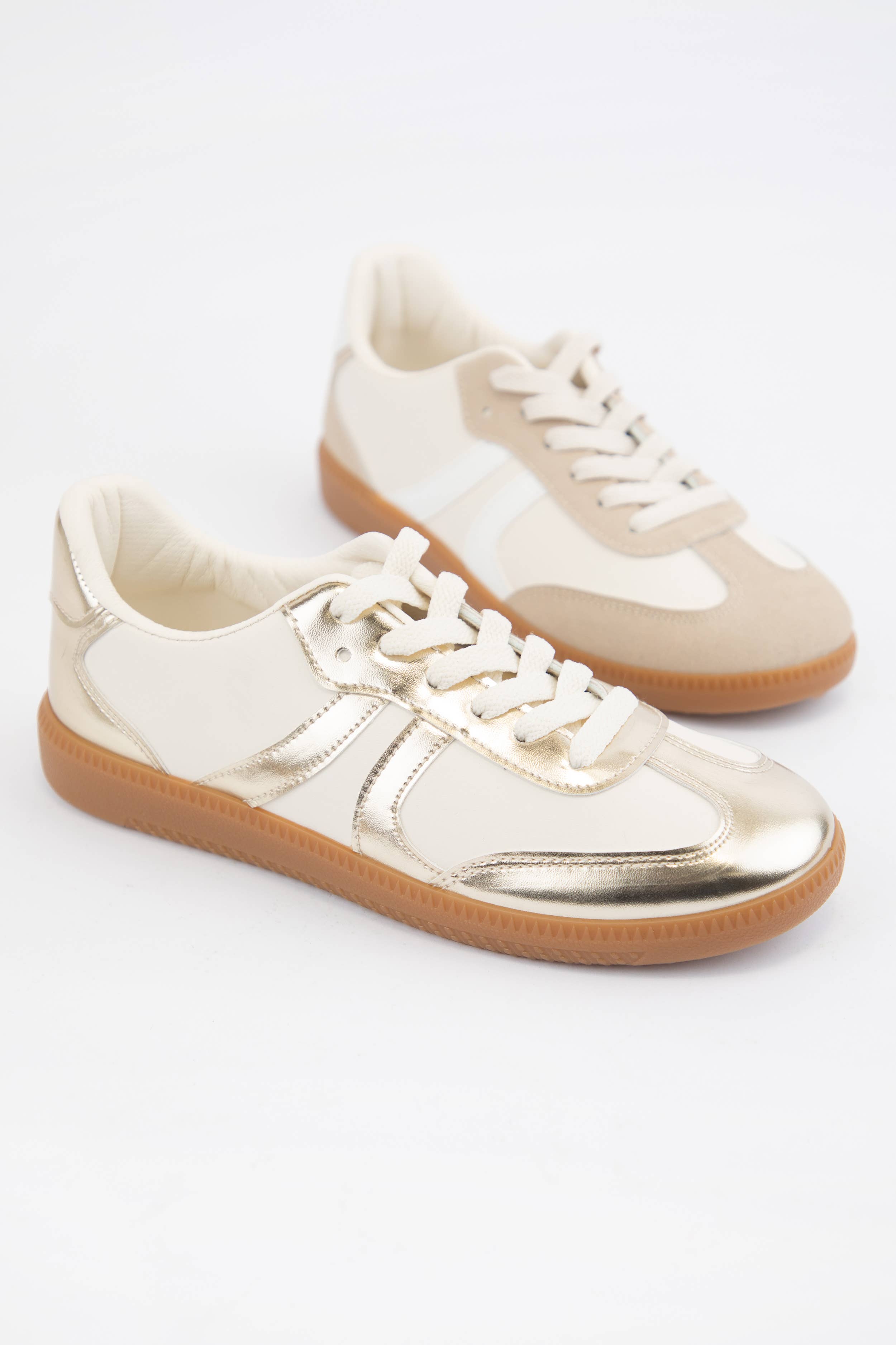 Embrace nostalgia with these retro-inspired sneakers! Featuring a unique strip design and a stylish gum-colored sole, these sneakers are sure to turn heads. Not only do they make a fashion statement, but they also provide comfort and support for all-day wear. Elevate your sneaker game and step out in style with the gold Kody sneaker.