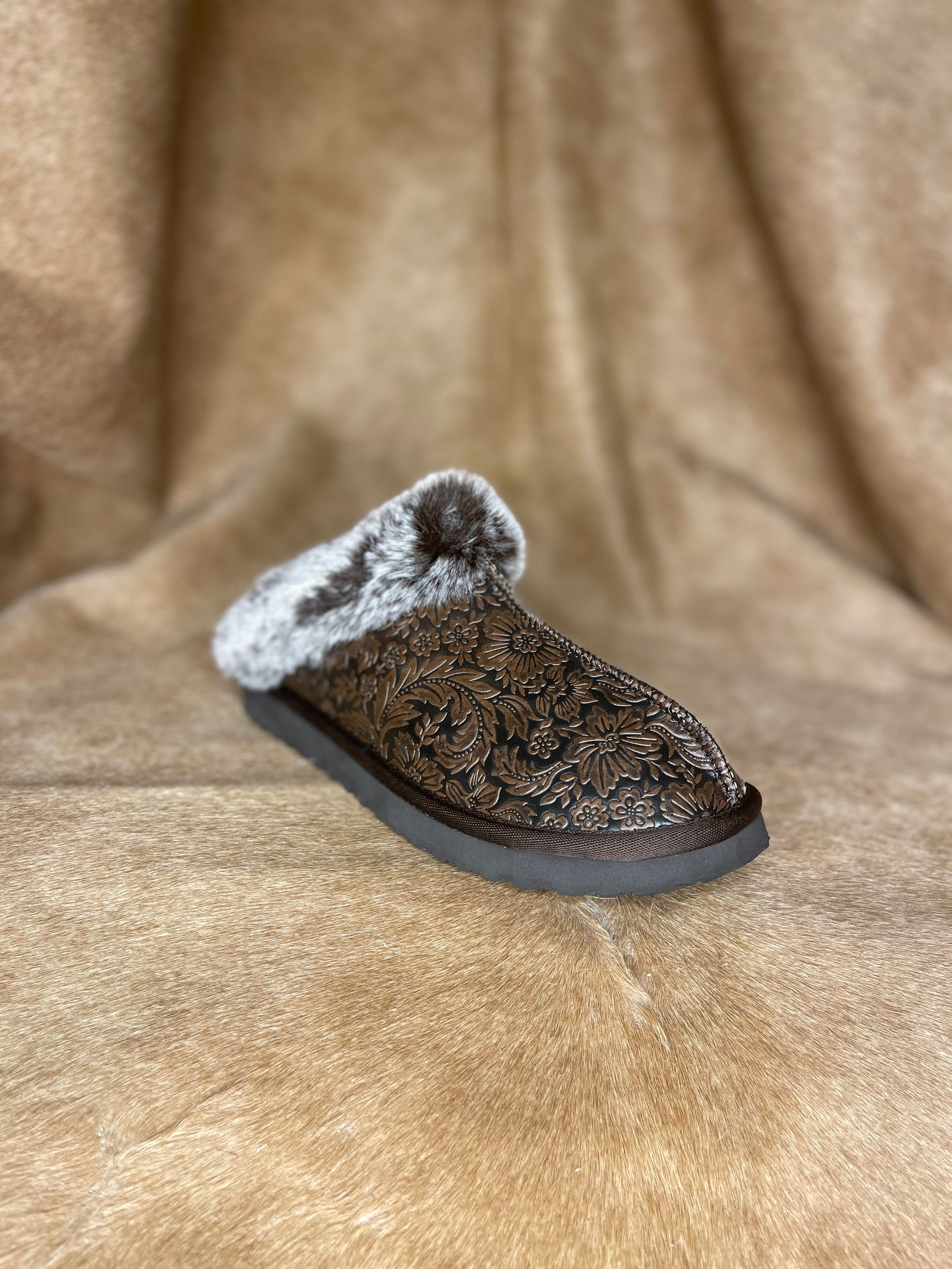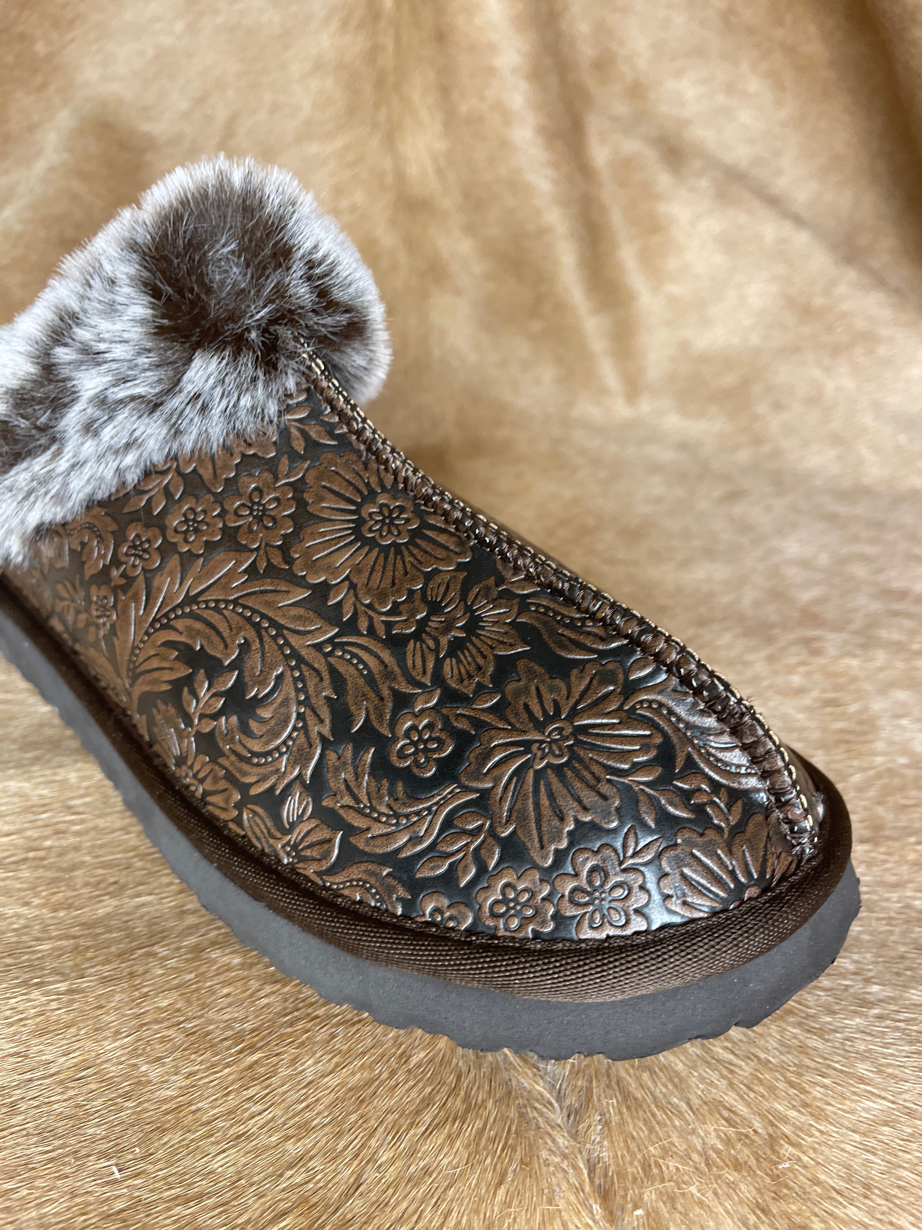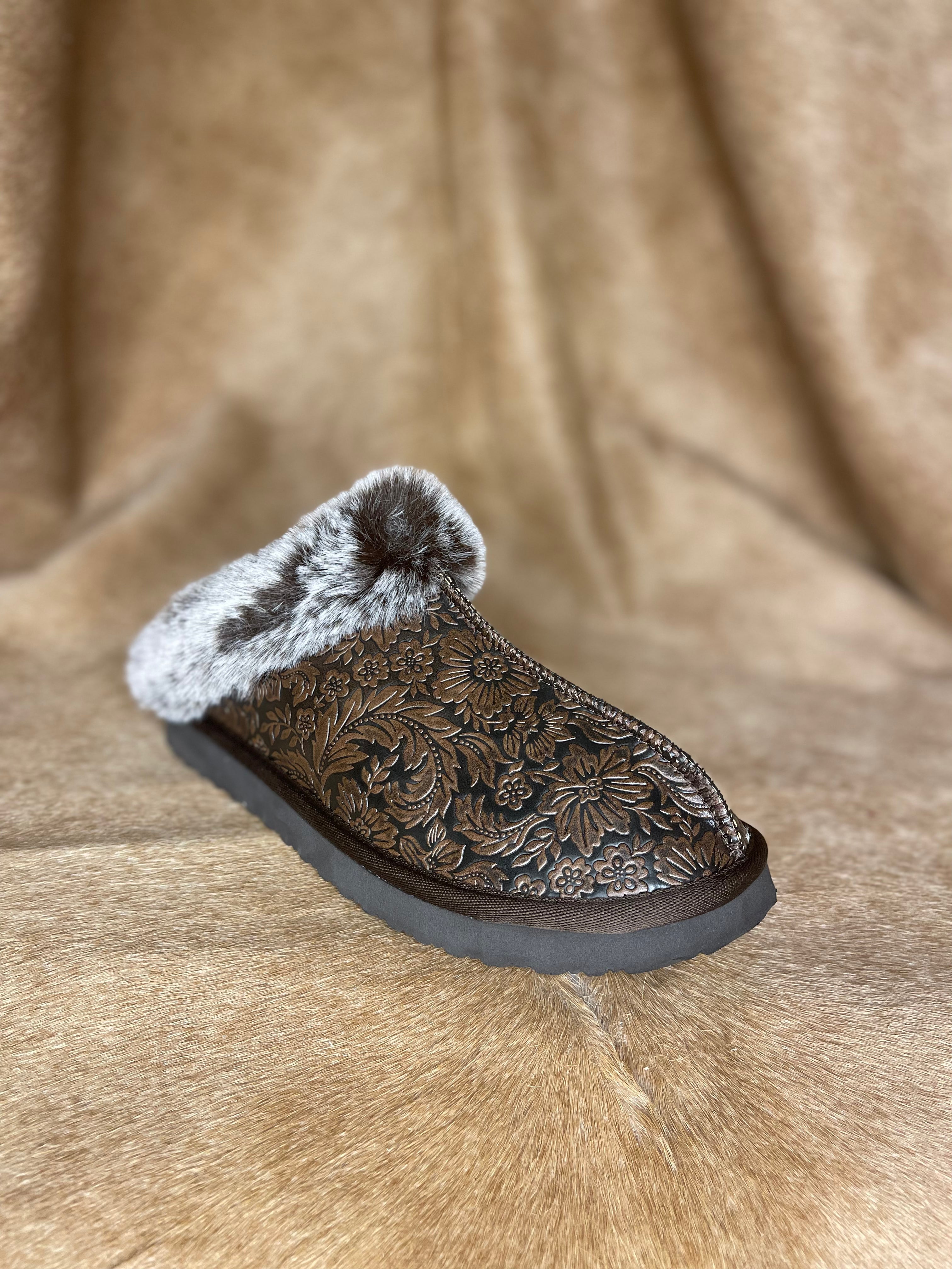 Saddle up for cozy style with the Lolly Slipper in Chocolate by Very G. These Western-inspired slippers merge rugged charm with luxurious comfort, showcasing embossed detailing that nods to classic Western motifs. Wrapped in plush faux fur lining, they deliver warmth and softness that feels like home on the range. The subtle nude hue complements any outfit, while the sturdy sole makes them perfect for kicking back by the fire or stepping out for quick errands. With the Lolly Slipper, enjoy a taste of Western elegance and frontier comfort, all in one stylish package.