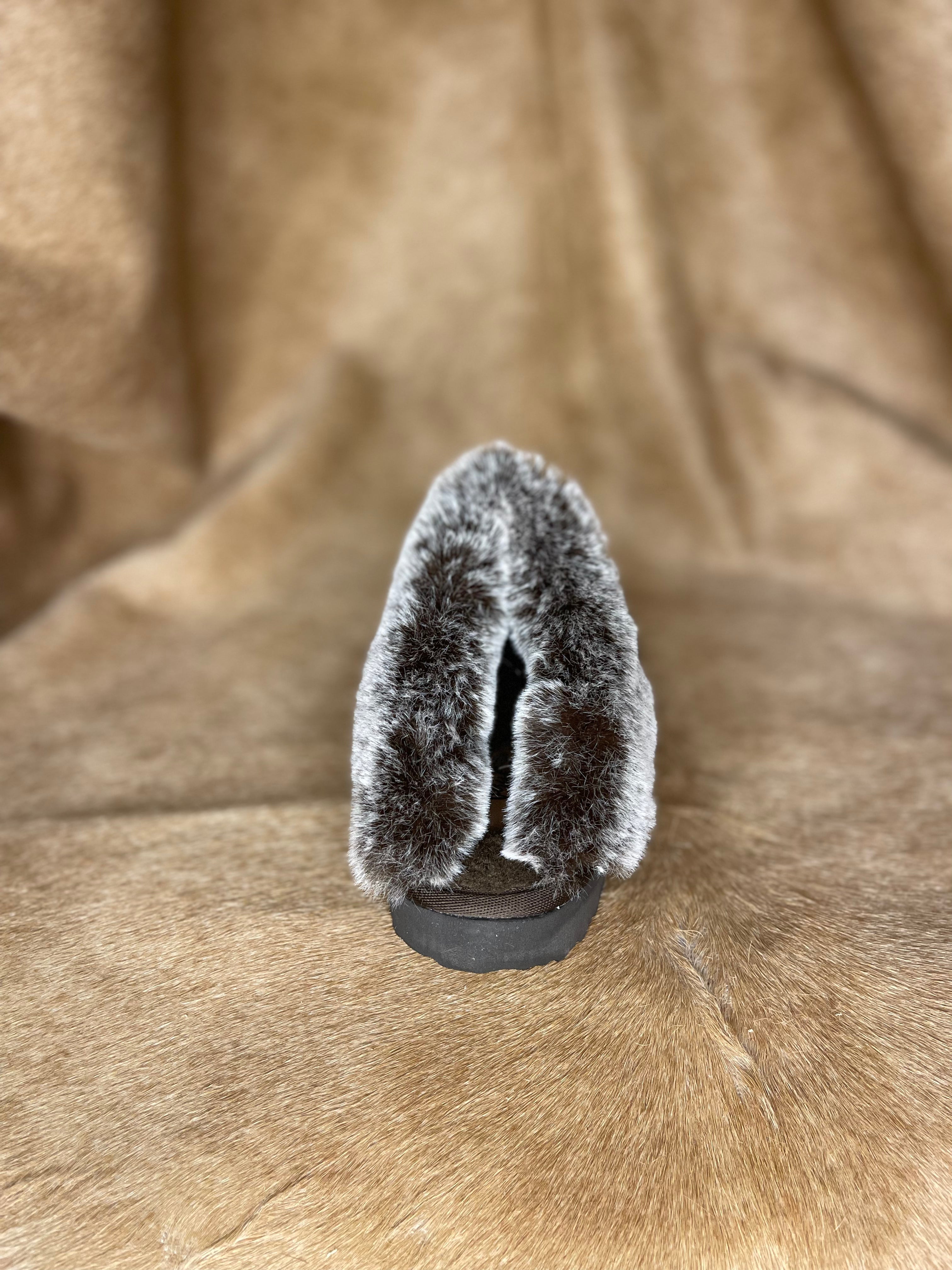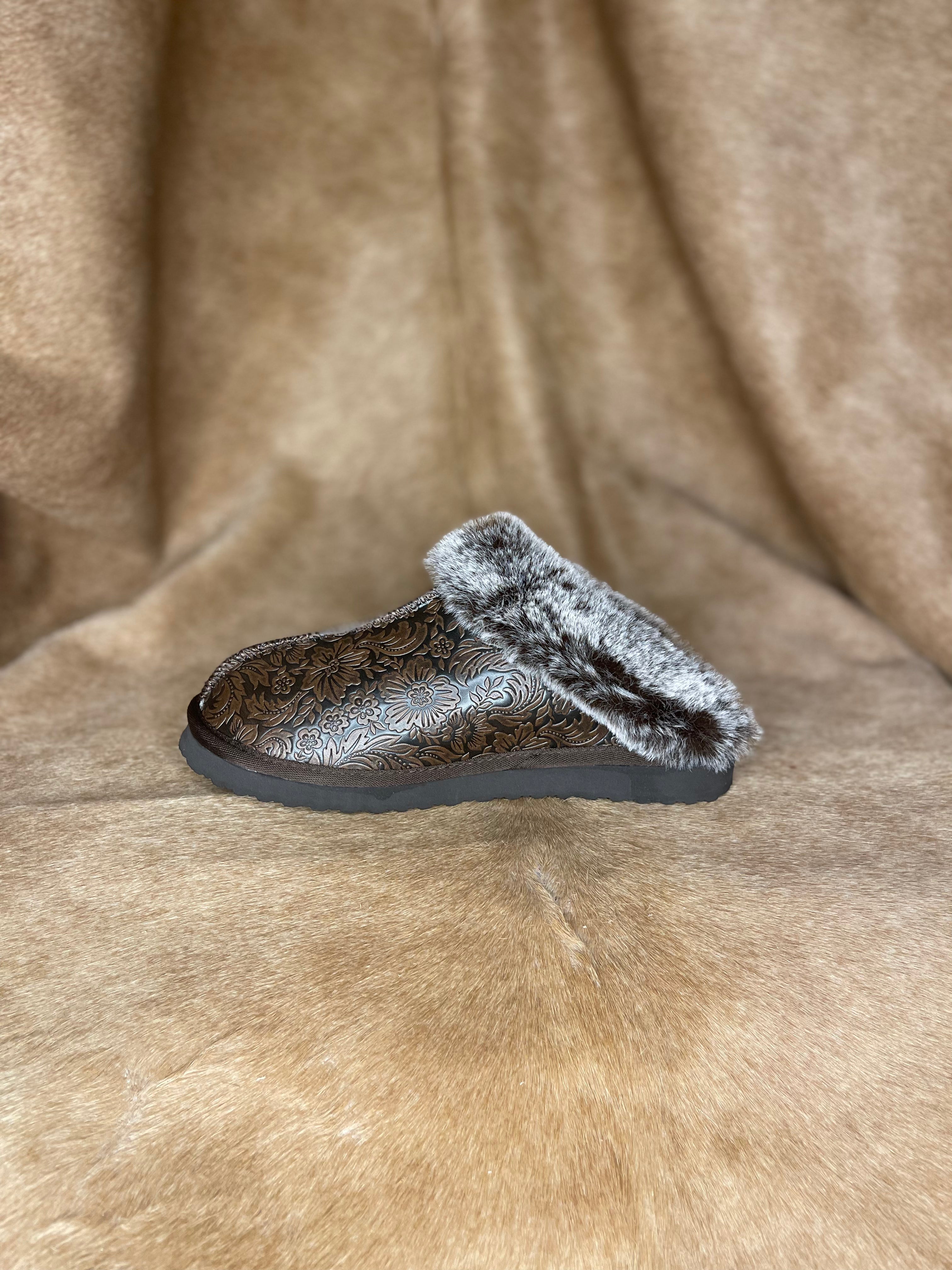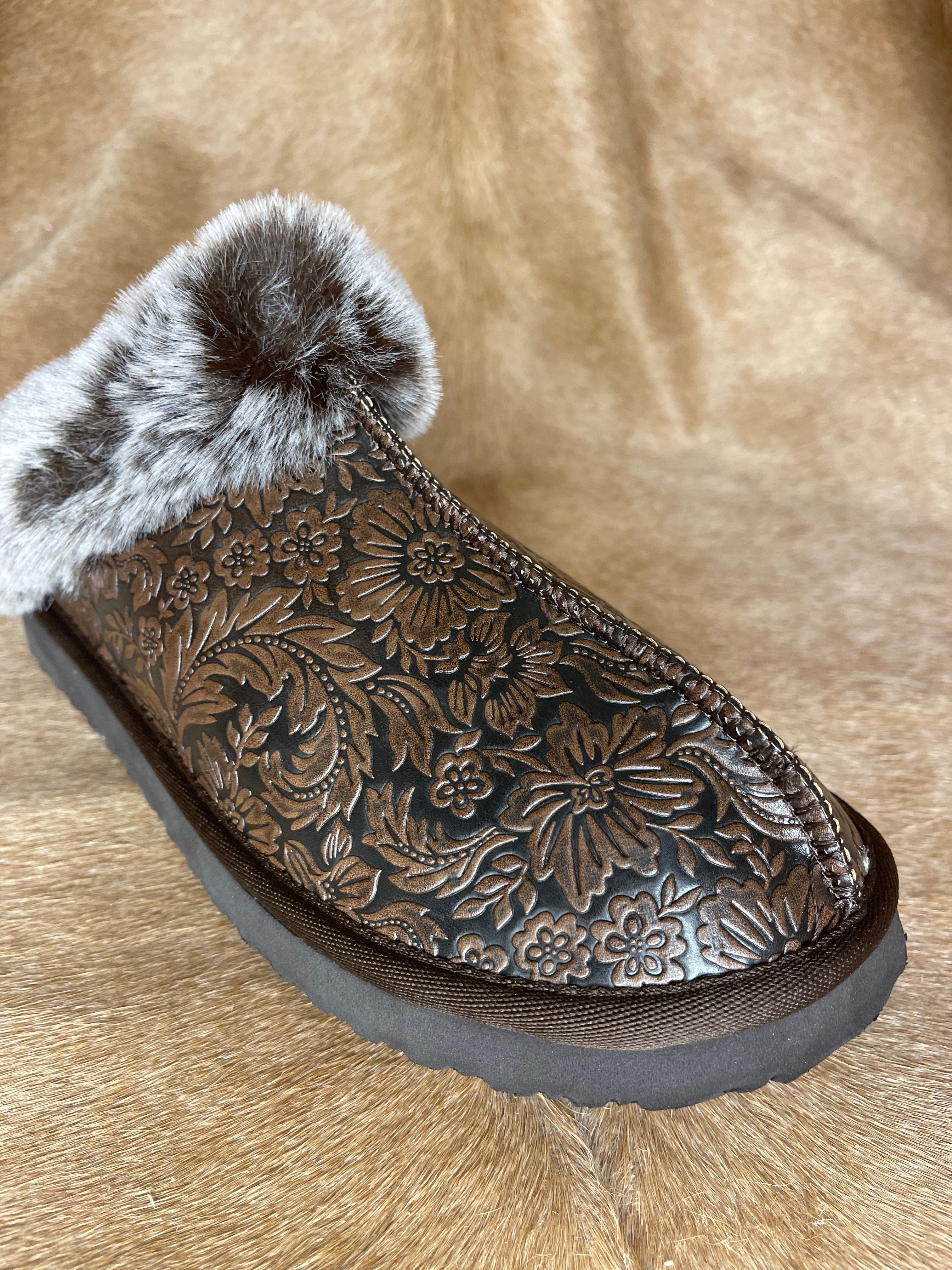 Saddle up for cozy style with the Lolly Slipper in Chocolate by Very G. These Western-inspired slippers merge rugged charm with luxurious comfort, showcasing embossed detailing that nods to classic Western motifs. Wrapped in plush faux fur lining, they deliver warmth and softness that feels like home on the range. The subtle nude hue complements any outfit, while the sturdy sole makes them perfect for kicking back by the fire or stepping out for quick errands. With the Lolly Slipper, enjoy a taste of Western elegance and frontier comfort, all in one stylish package.
