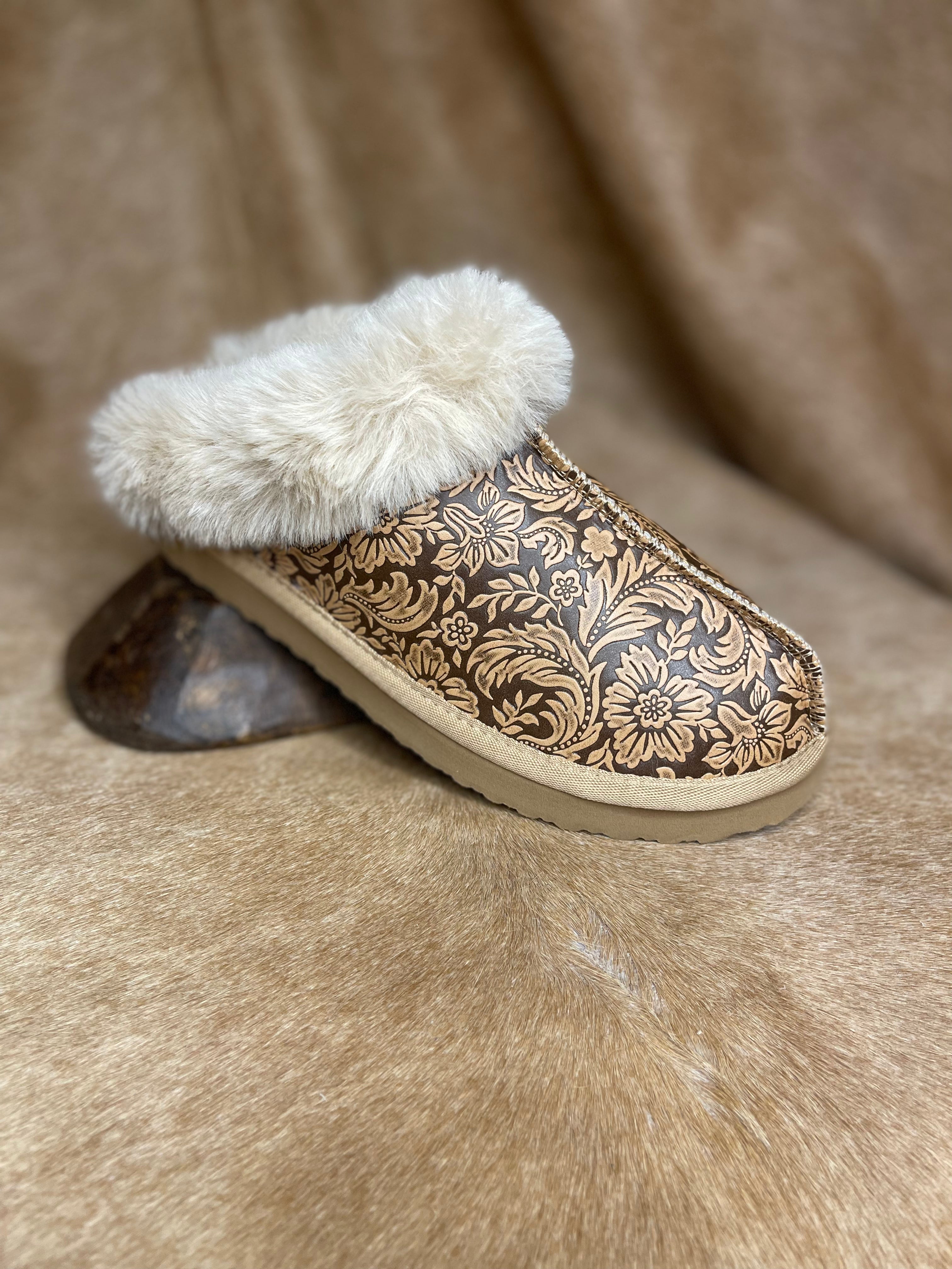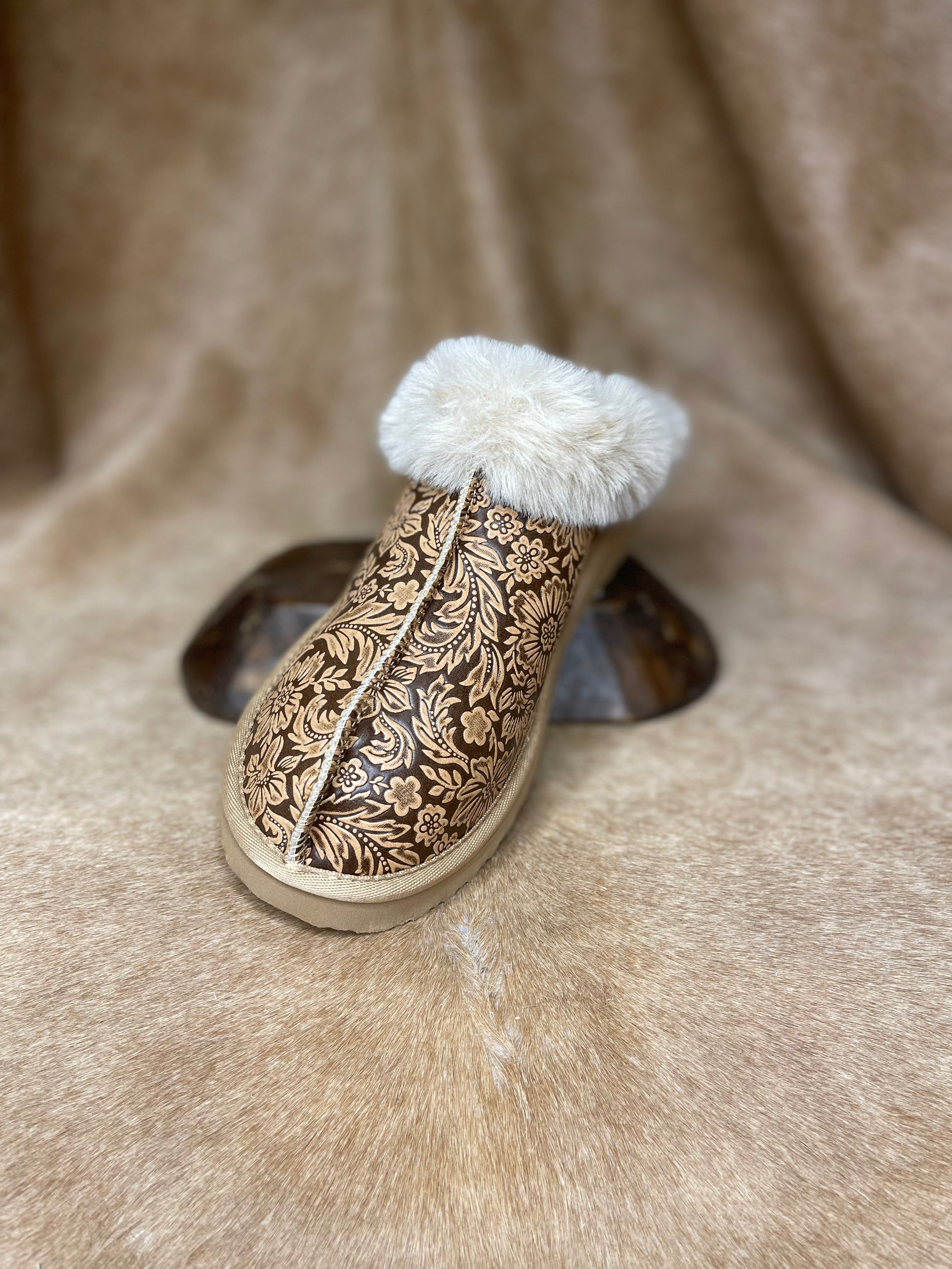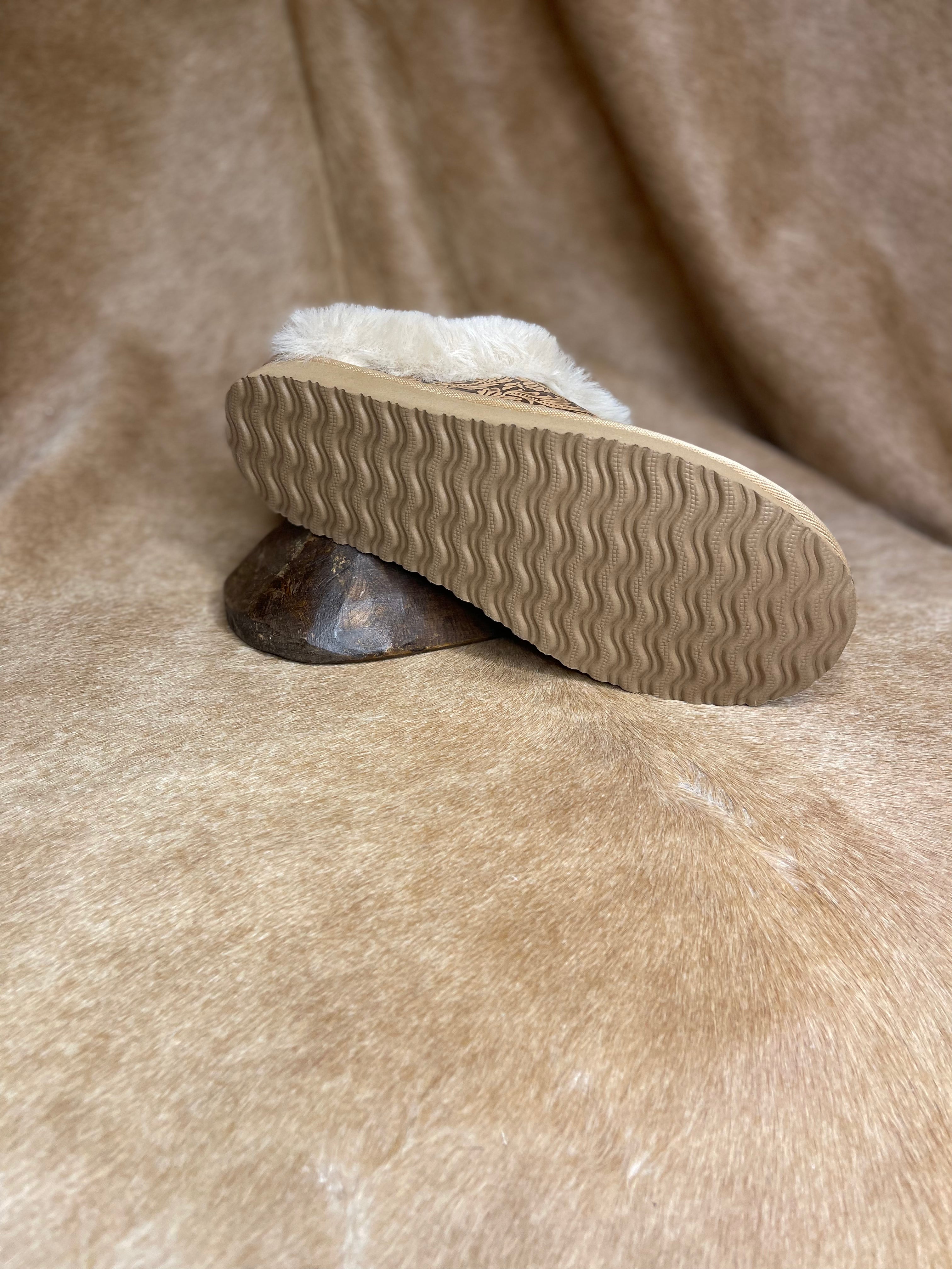 Saddle up for cozy style with the Lolly Slipper in Nude by Very G. These Western-inspired slippers merge rugged charm with luxurious comfort, showcasing embossed detailing that nods to classic Western motifs. Wrapped in plush faux fur lining, they deliver warmth and softness that feels like home on the range. The subtle nude hue complements any outfit, while the sturdy sole makes them perfect for kicking back by the fire or stepping out for quick errands. With the Lolly Slipper, enjoy a taste of Western elegance and frontier comfort, all in one stylish package.