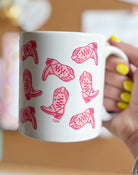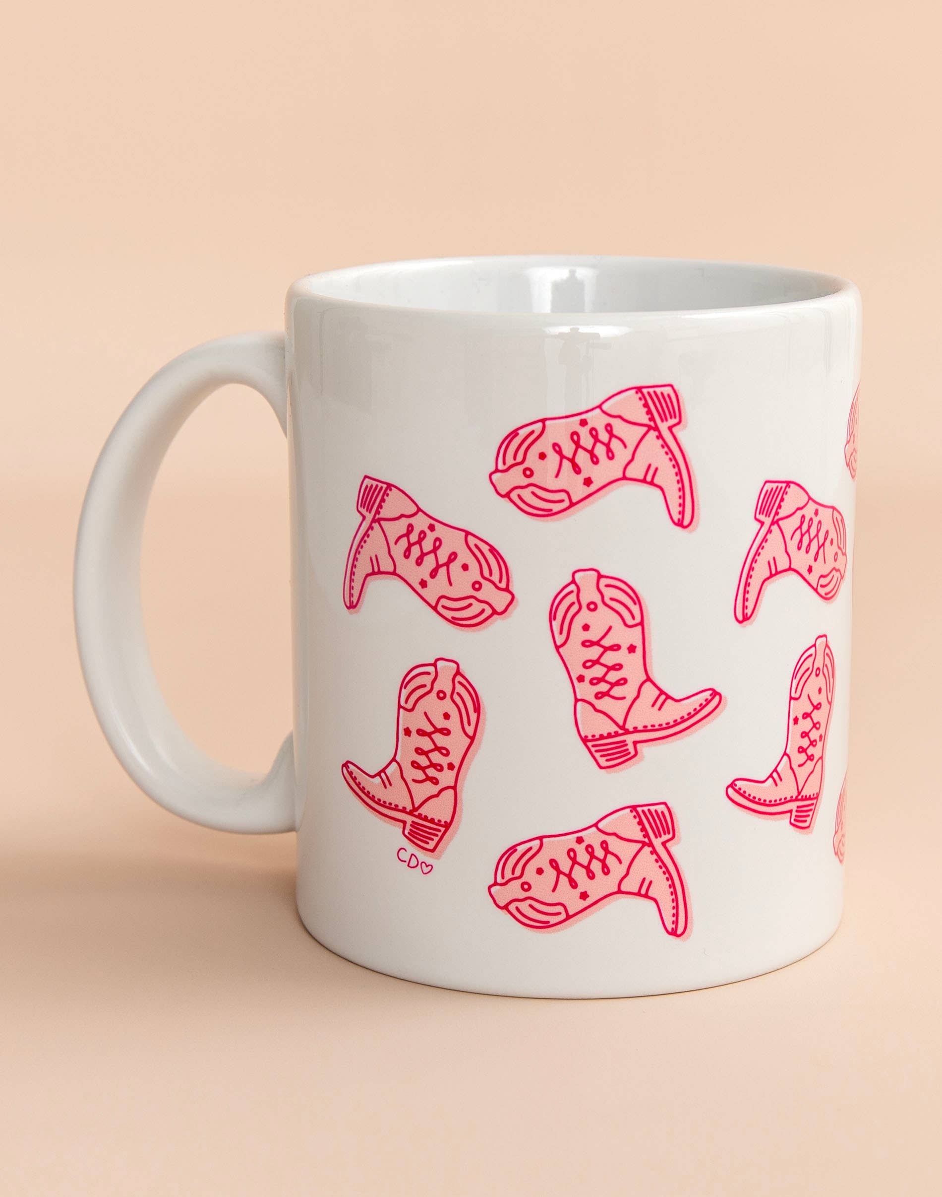 Say Yee-Haw with our Western Cowgirl Boots Mug! Featuring hand-drawn pink cowgirl boots, this latte glass is a fun way to enjoy coffee, tea, or sparkling water. Perfect for gifting for birthdays, bachelorette parties and more this fun drinkware will make a statement wherever you go. •Material: Ceramic •Holds: 11oz / 325 ml •Dishwasher & microwave safe