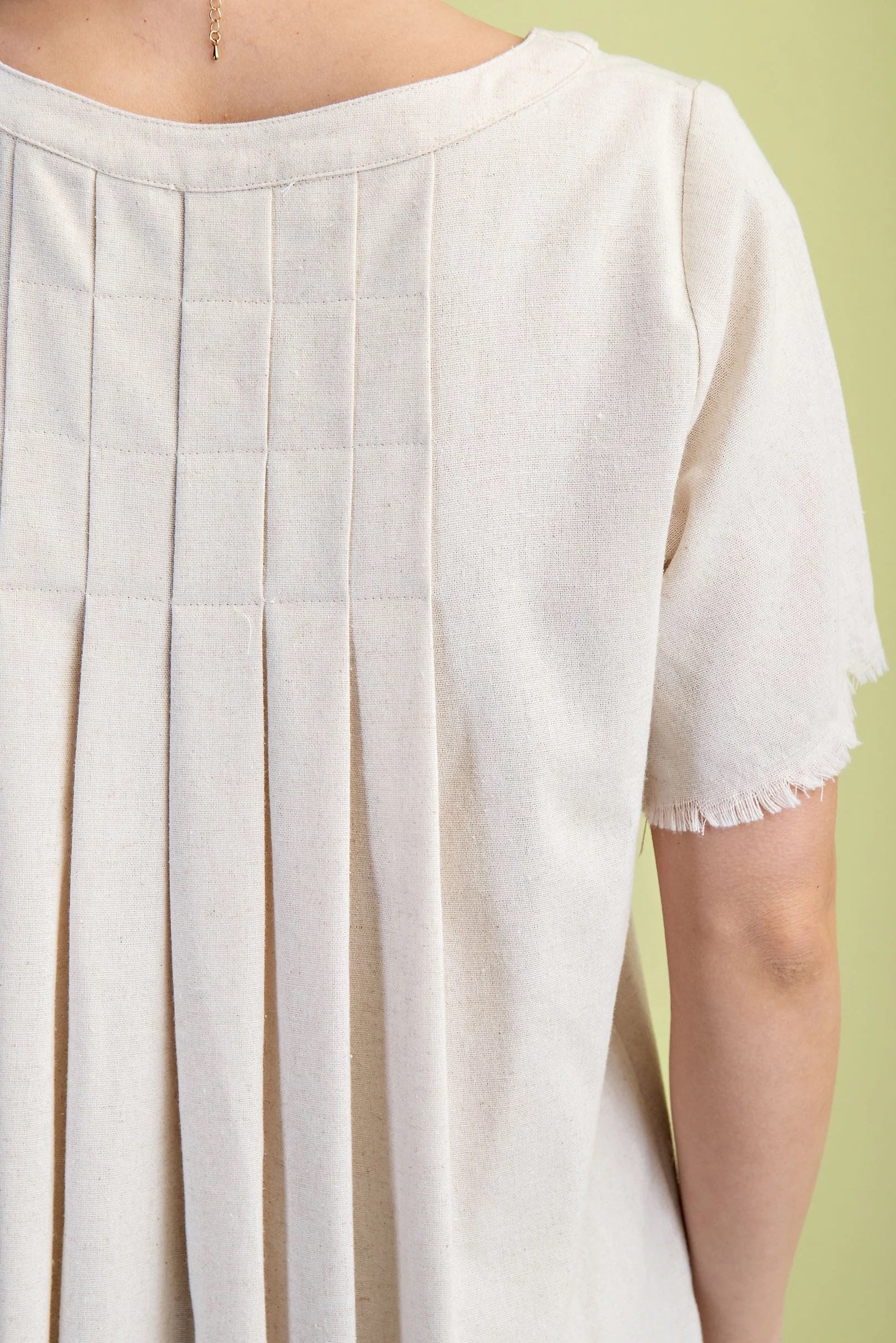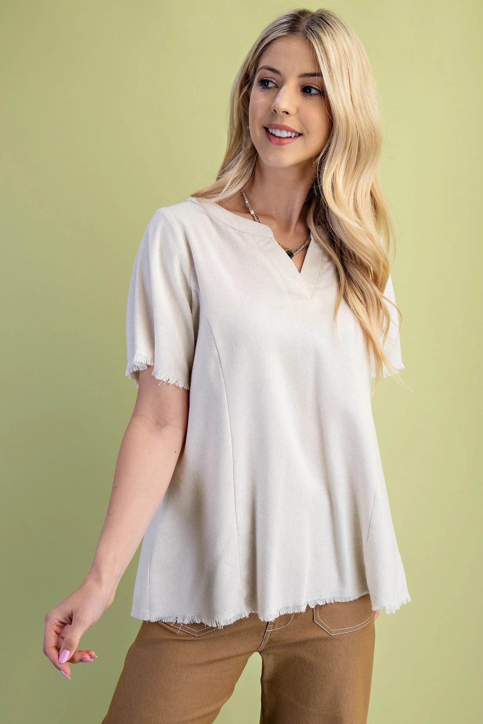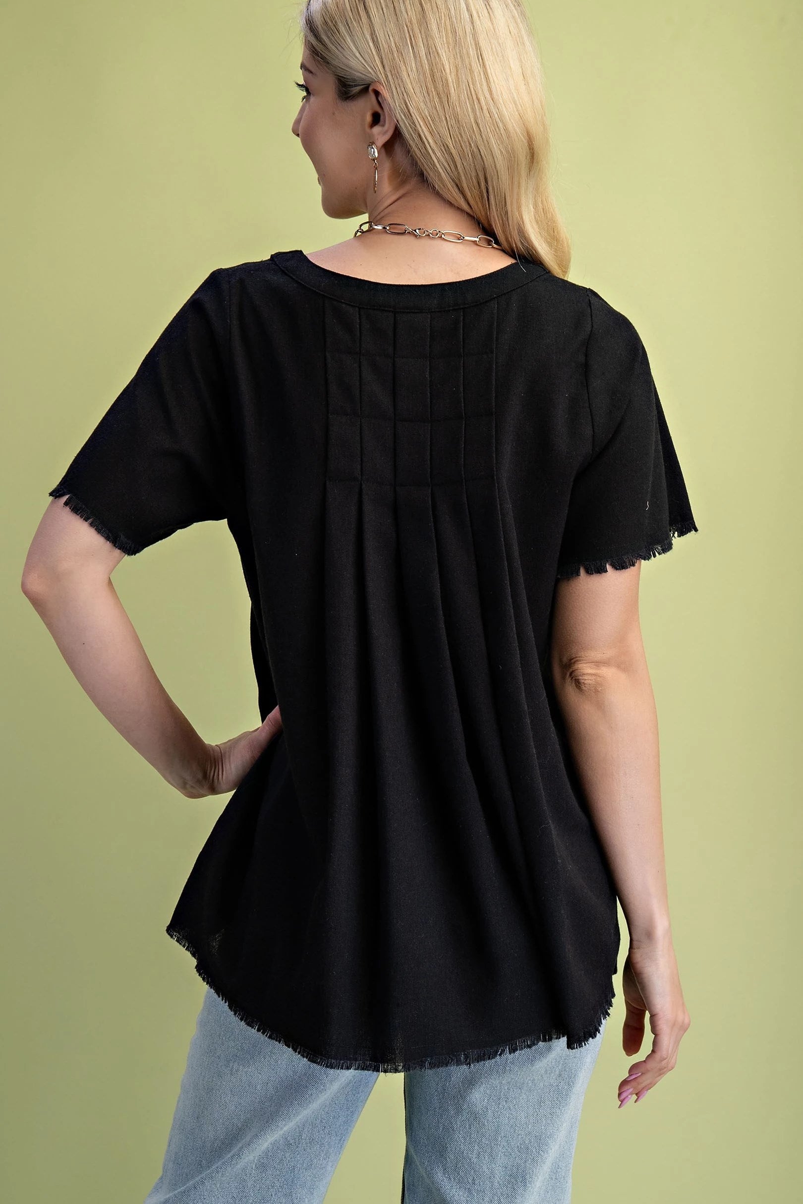 Elevate your wardrobe with the Betty Linen Short Sleeve V-Neck Top, designed for those who dare to stand out. Featuring a flattering V-neckline and raw-edge sleeves, this top exudes effortless cool. The pleated back adds a unique twist, creating movement and dimension that commands attention. Crafted from breathable linen, it keeps you comfortable while making a bold style statement. Perfect for pairing with your favorite jeans or skirts, this top transforms everyday looks into fearless fashion moments. Embrace your daring side with the Betty Linen Top—where comfort meets edgy sophistication.