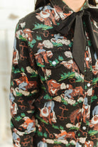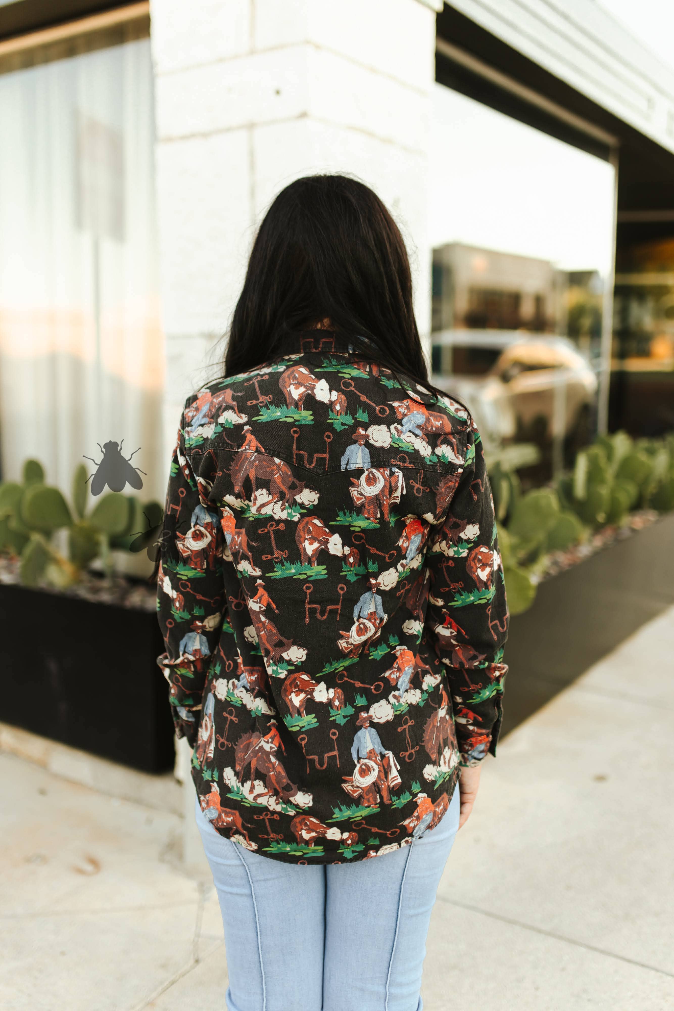Saddle up for a bold, ranch-raised classic that celebrates true Western heritage. This snap-up blouse is made from soft brushed cotton with an allover cowboy, cowgirl, horse, and Hereford cattle print — a standout piece that tells its story without saying a word.