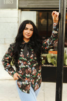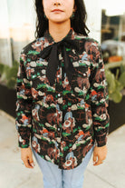 The silhouette is slightly oversized, giving you the option to wear it buttoned as a blouse or open as a lightweight shacket. Pearl snaps, chest pockets, and the vintage ranch-life artwork create that perfect blend of personality and practicality.