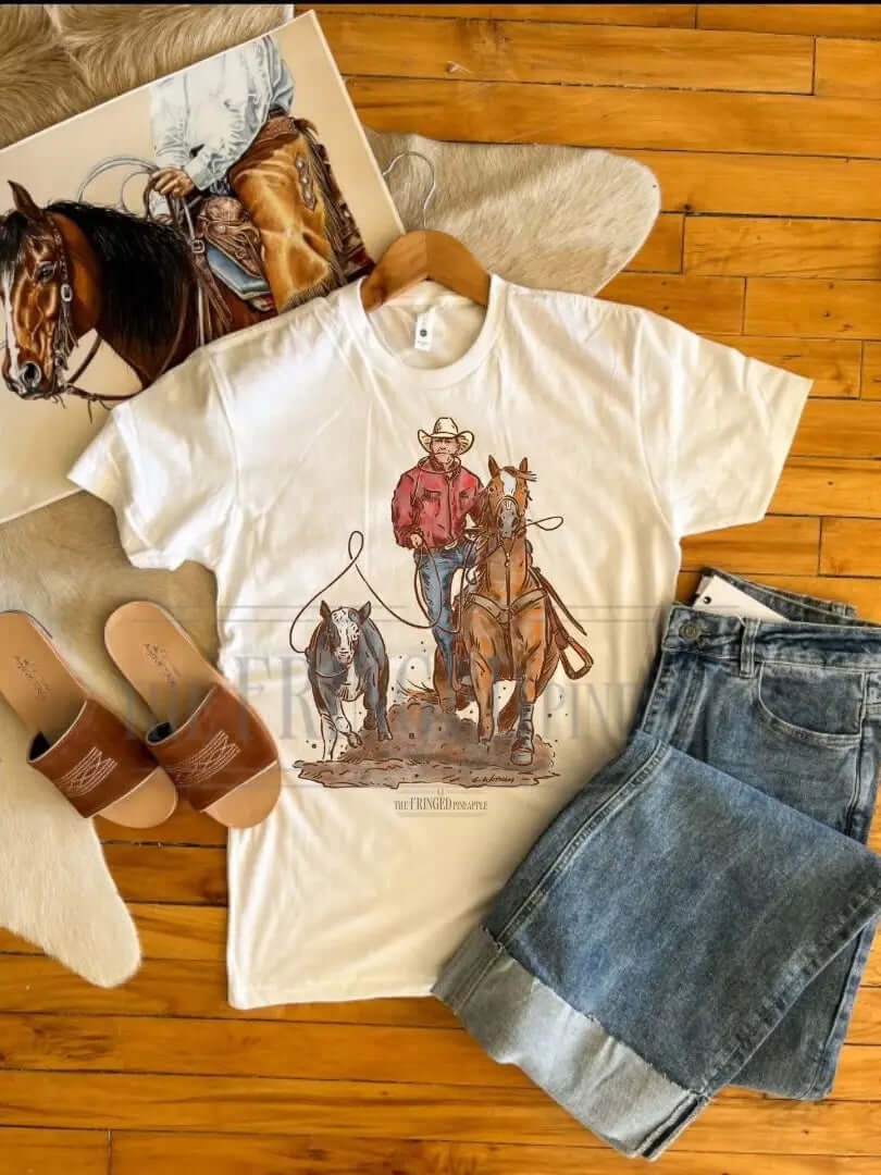 Embrace the true spirit of rodeo with this Calf Roping Graphic Tee, designed for those who love the action and energy of western sports. Featuring a round crew neck and a unisex fitted style, this tee is comfortable and versatile for both men and women. The earthy tones evoke the feeling of being right arena-side, capturing the excitement of calf roping in a stylish and casual way. Perfect for rodeo fans, western wear lovers, or anyone looking to add a touch of cowboy-inspired fashion to their everyday wardrobe.