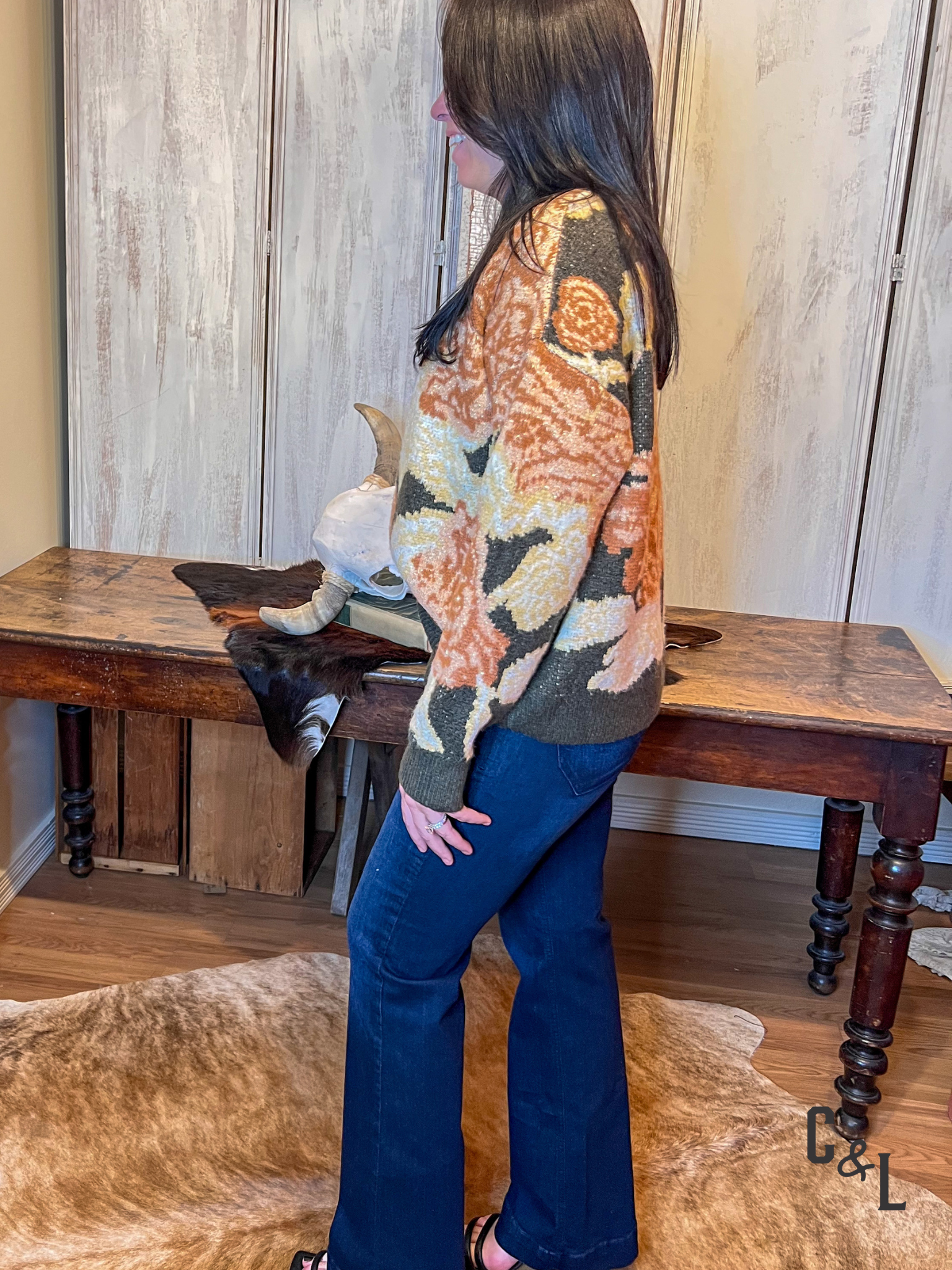 Meet the Harvest Bloom Sweater—autumn florals with a hint of shimmer. This soft knit features a dark brown backdrop dotted with rust, peach, yellow, and cream blooms, then kissed with fine gold thread for low-key sparkle that catches the light. Finished with a classic crew neck and long sleeves, it pairs beautifully with denim, satin midis, or leather minis for day-to-night style.