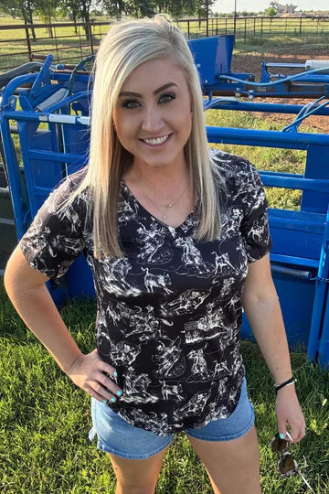Saddle up for style in our Rodeo Road V Neck Top! This butter-soft beauty hugs you in all the right places with its stretchy, oh-so-comfy fabric. Adorned with eye-catching rodeo prints, it's the perfect blend of Western charm and playful flair. Your new favorite top just rode into town!