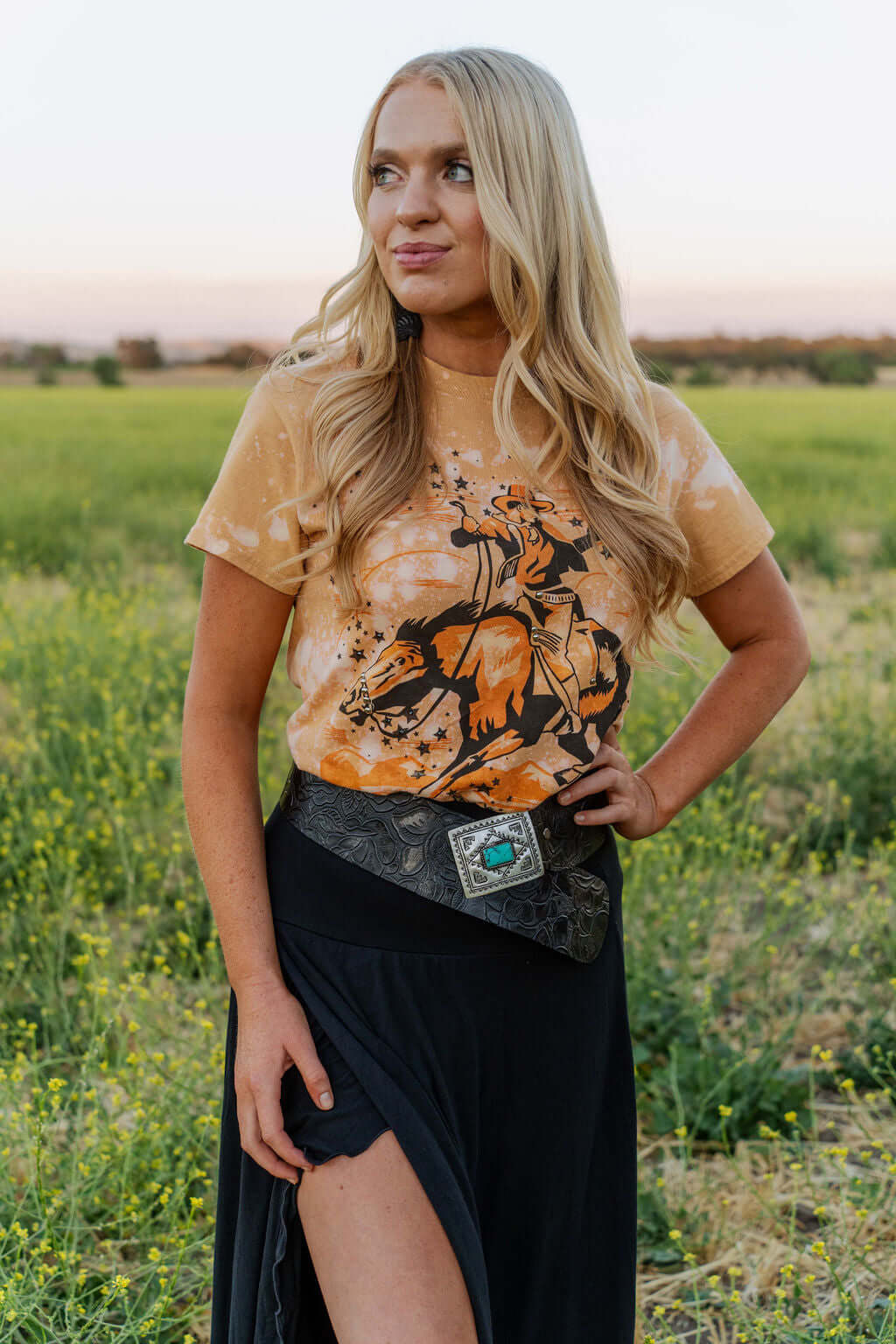 - Are your tops suitable for a Western-inspired style? Yes. We curate our collection with a classic Western aesthetic in mind. Many of our tops feature rustic designs, vintage-inspired graphics, or classic silhouettes that pair perfectly with our denim and leather accessories. They are a great way to show off your cowgirl style.