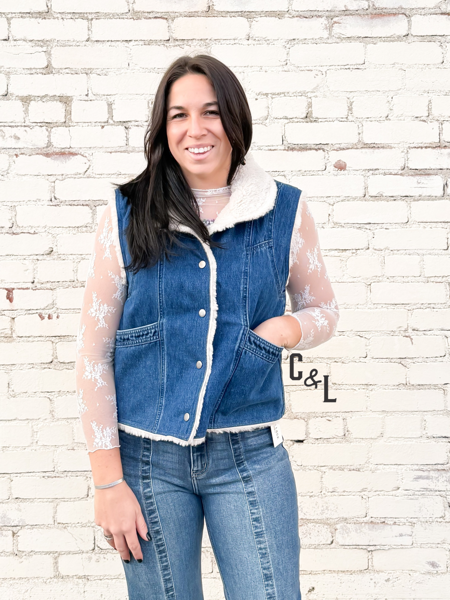 Mesa Trail Teddy Gilet — Mid-Blue Denim & Shearling Vest