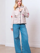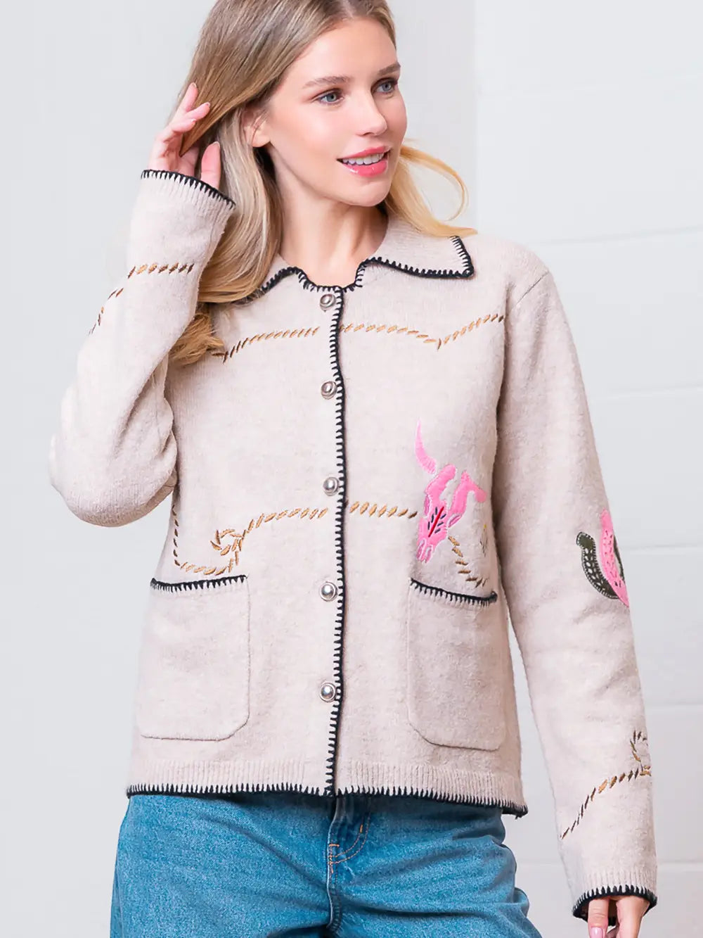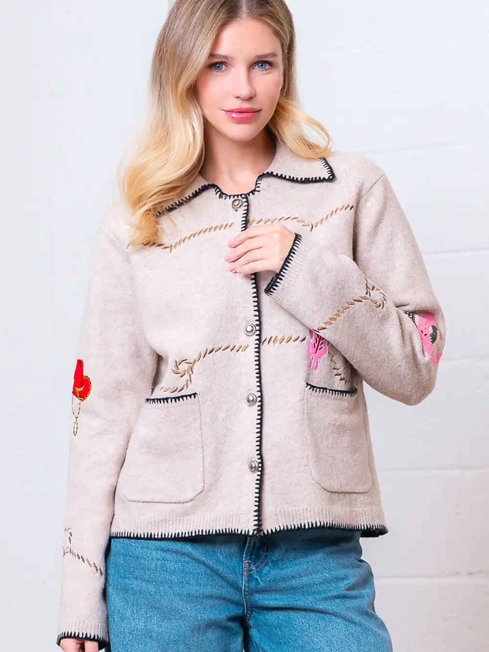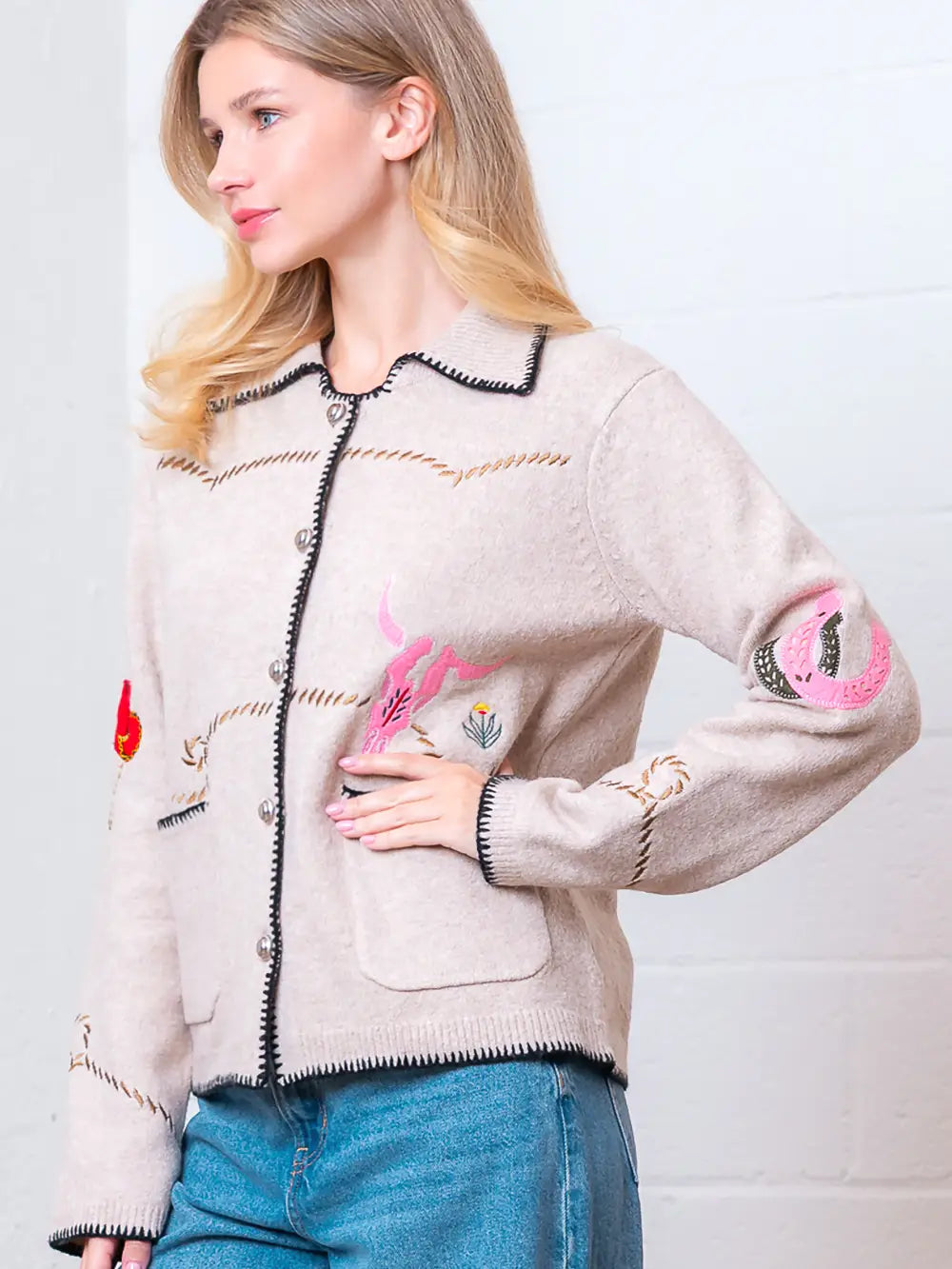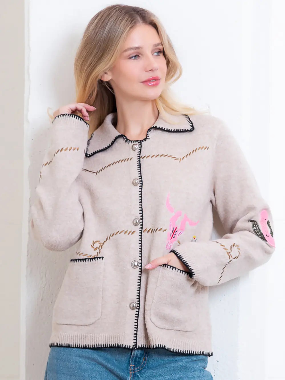 The Sagebrush Embroidered Sweater Jacket — a cozy Western-inspired layer that blends rugged charm with a feminine touch. Crafted in a soft oatmeal hue, this collared button-up sweater jacket features intricate Western embroidery, including rope details and pink steer skull accents, making it a true statement piece for the modern cowgirl.