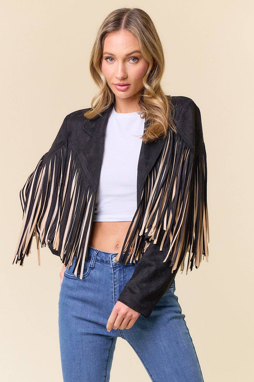 This playful western jacket features vibrant multi-color fringe and an open front design, making it ideal for rodeo and cowgirl events. Lightweight and comfy, it’s crafted from 90% polyester and 10% spandex with a stylish collar. Perfect for adding a fun, suede-inspired flair to your fall wardrobe!