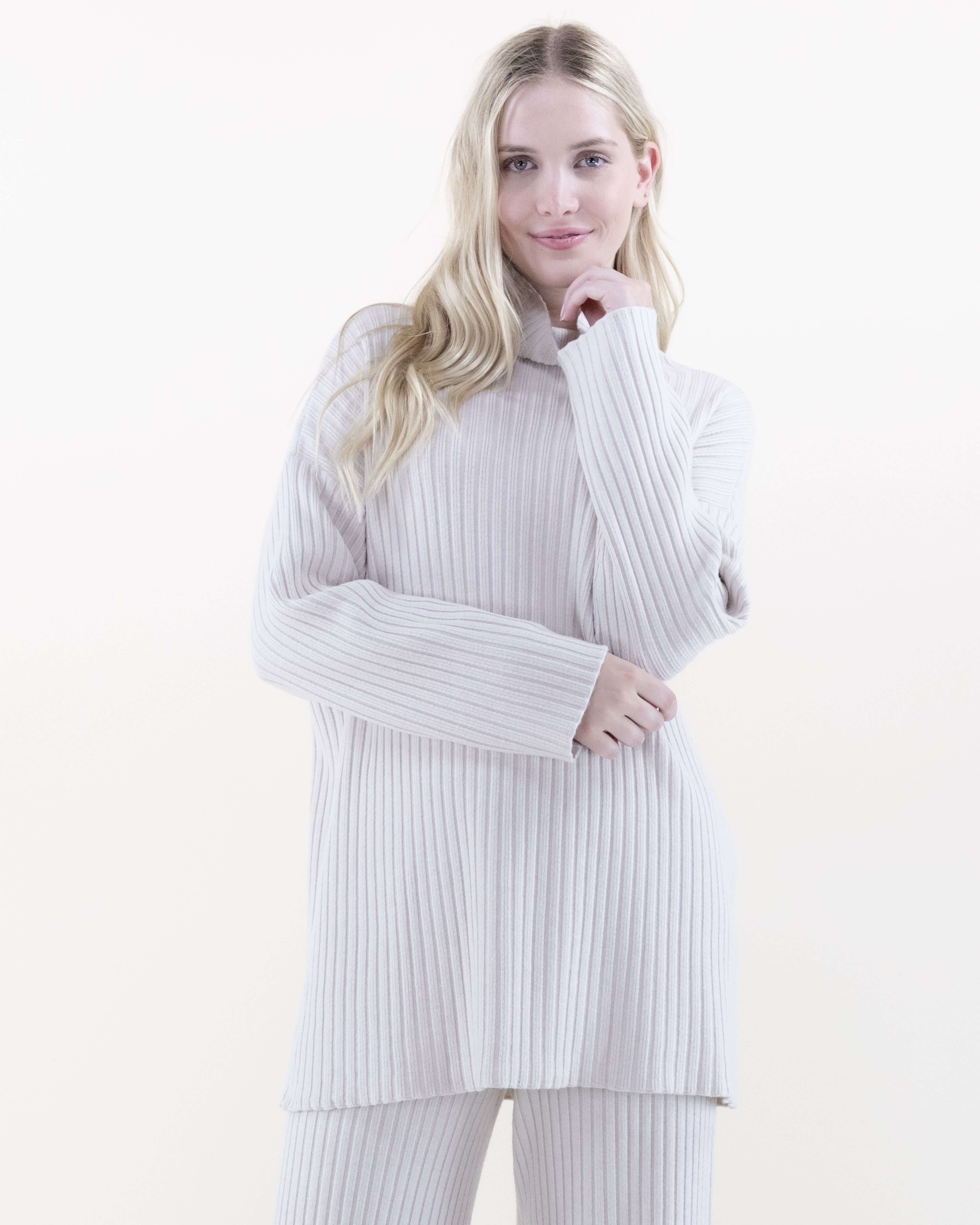 Beige Casual Ribbed Mock Turtle Neck Long Sweater