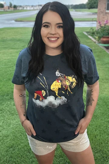 This adorable tee celebrates patriotic spirit with a playful cowboy twist! Soft fabric hugs you in comfort while bold graphics capture the magic of fireworks lighting up the night sky. Perfect for your Fourth of July adventures, whether you're riding horses or simply enjoying summer festivities. Saddle up and show your stars and stripes in the cutest way possible!