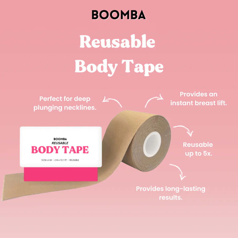 BOOMBA's Reusable Body Tape can be reusable up to five times. Designed to contour with your shapes, our body tape is gentle yet strong, providing long-lasting results for up to 12 hours.