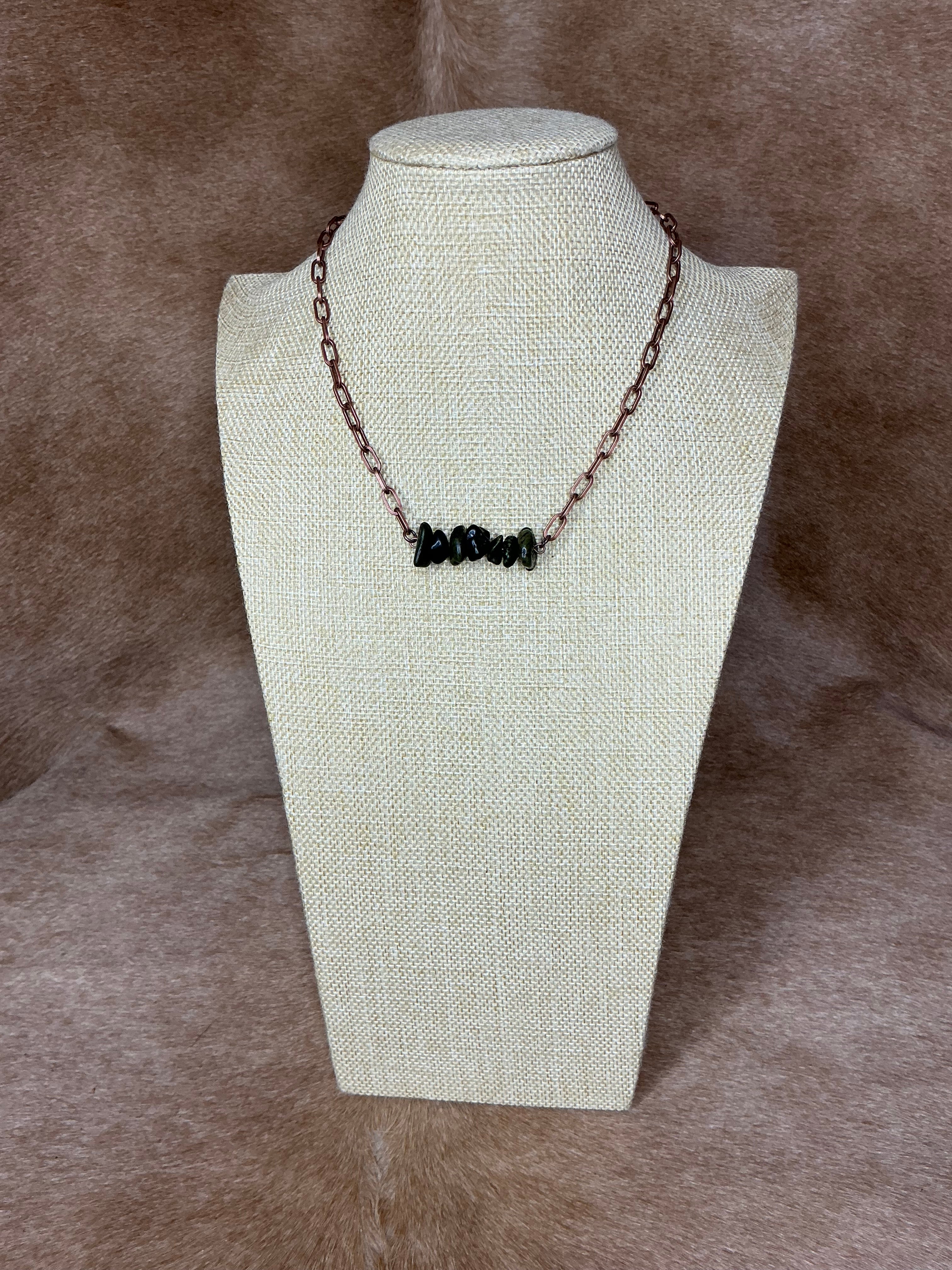 Simple, earthy, and artisan-made. This necklace features a green jade chip bar paired with a modern copper paperclip chain for an easy, layer-friendly look. Handcrafted by Copper & Lace Western Boutique in Paso Robles, California, each piece is unique—bringing natural texture and Western-boho polish to any outfit. Proudly Made in the USA.