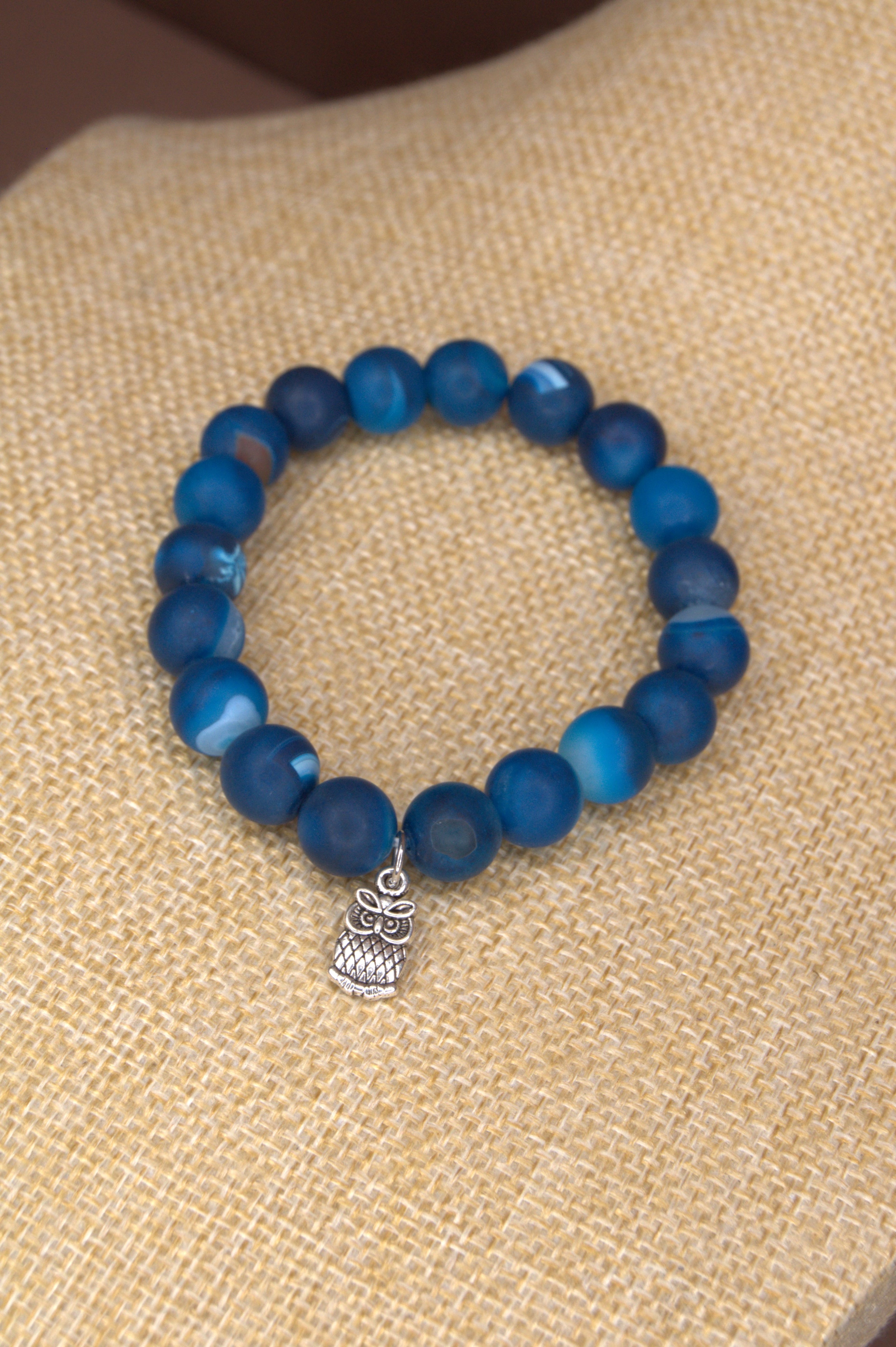 Antique silver Owl charm and beautiful shades of matte stripe blue agate round 10mm beads strung on stretch cording.