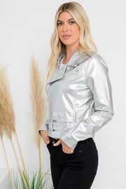 The Calistoga Metallic Moto Jacket — a bold, high-shine statement piece that brings modern edge to classic Western cool. Crafted from premium faux leather, this cropped moto jacket shimmers with a sleek metallic silver finish, catching the light (and attention) from every angle.