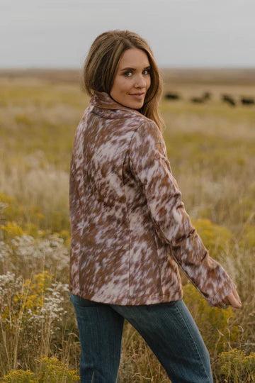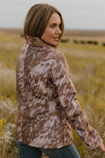 Make a bold statement with the Cows Come Home Blazer, featuring an eye-catching cowhide pattern that adds a unique edge to your wardrobe. Designed to stand out, this blazer effortlessly combines classic tailoring with wild style, perfect for elevating any outfit. Whether at a casual gathering or a night out, this blazer brings confidence and character to your look. NOT real cowhide, just a print, but it feels like hair. The cow print has a slight pink hue which you can see in some of the pictures. Size down in small sizes and stay in your size in plus as there is no stretch.... just an opinion.