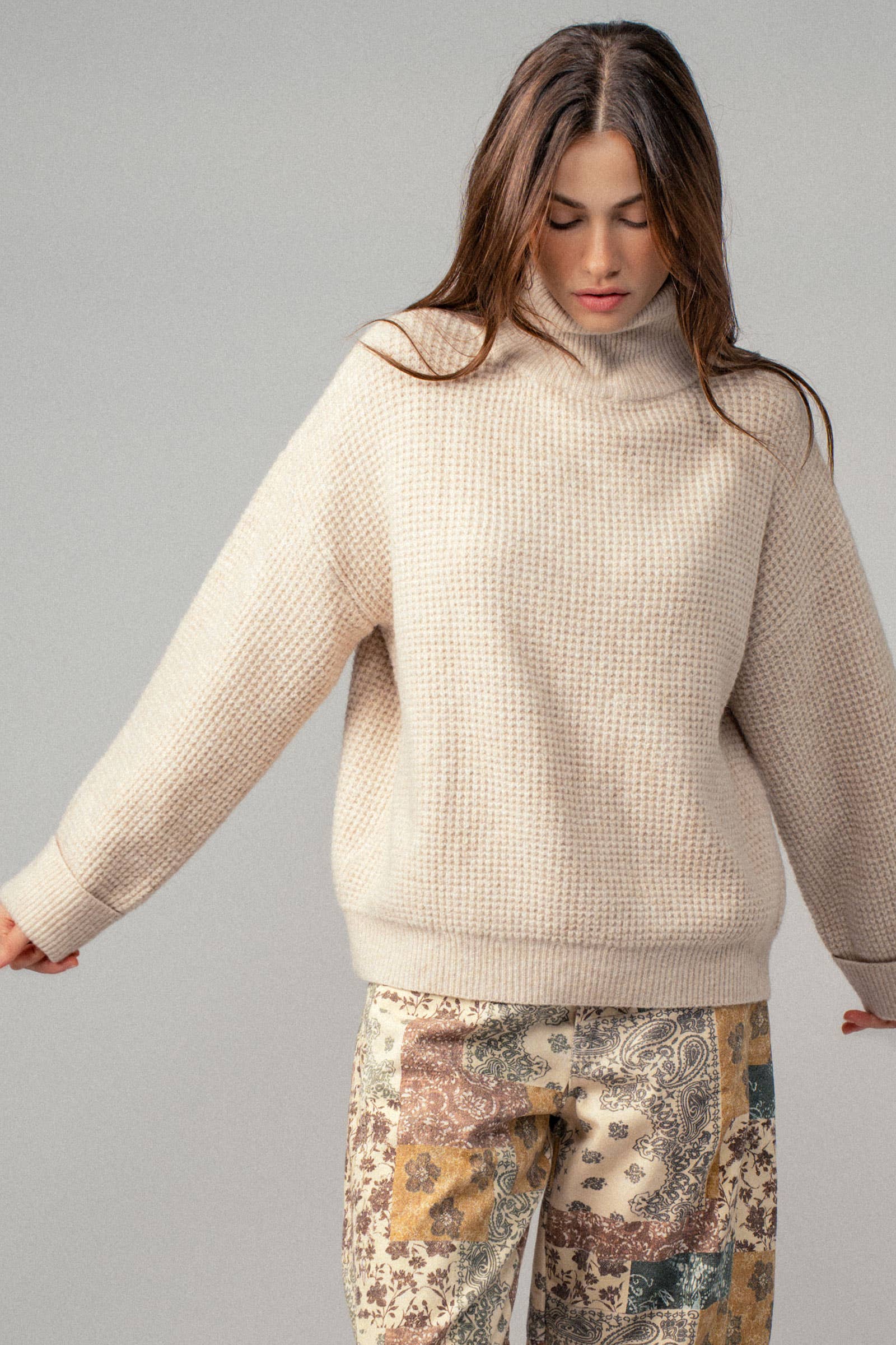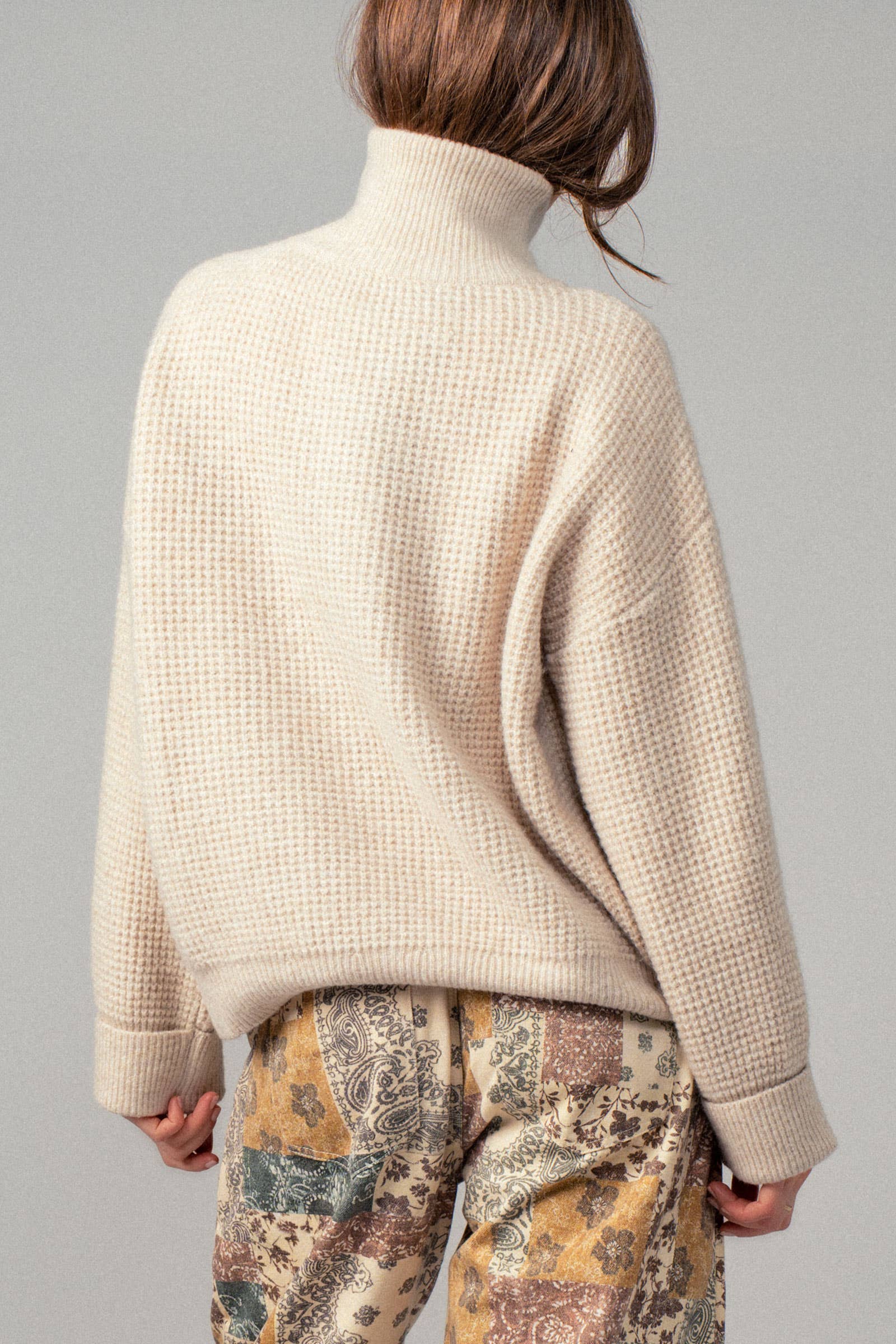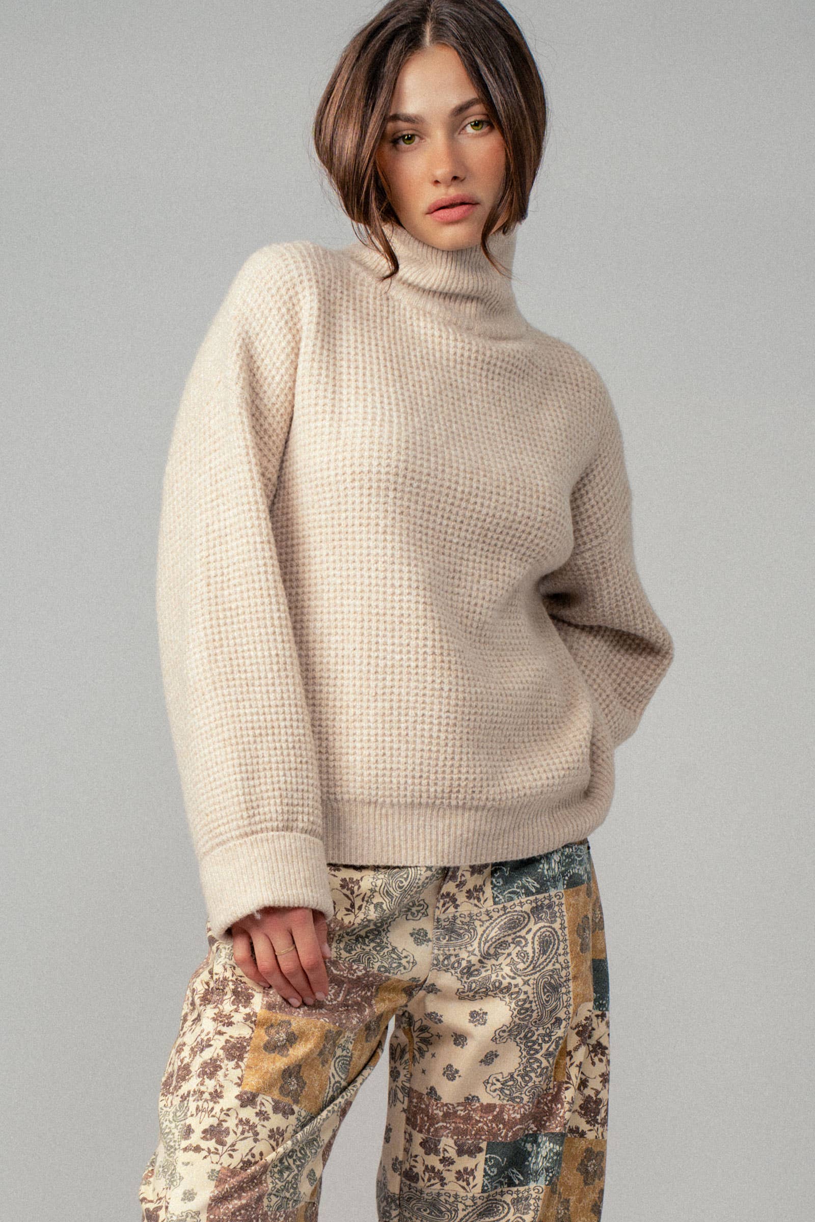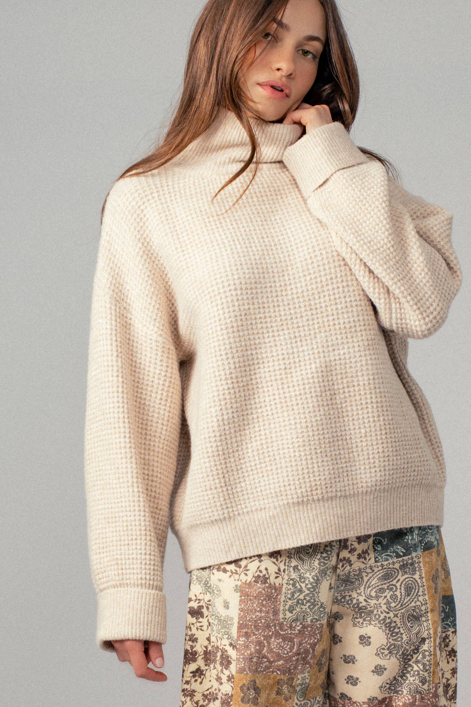 Cozy texture with Western ease. The Mae Waffle Knit Sweater blends laid-back boho style with everyday comfort. The soft, textured waffle knit adds warmth and visual interest, while the versatile Western-inspired design pairs effortlessly with denim, skirts, and your favorite boots. Finished with a high neckline and dropped shoulders for that relaxed, oversized look.