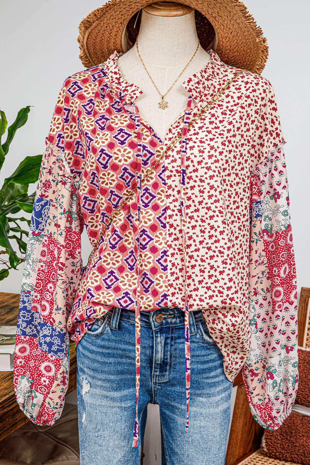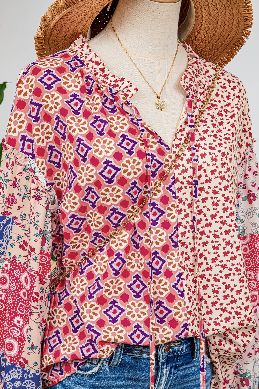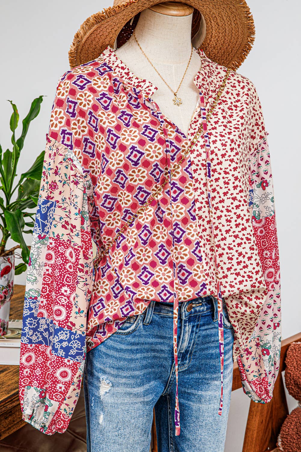 Jane Boho Mix Floral Long Sleeve Tied V Neck Blouse