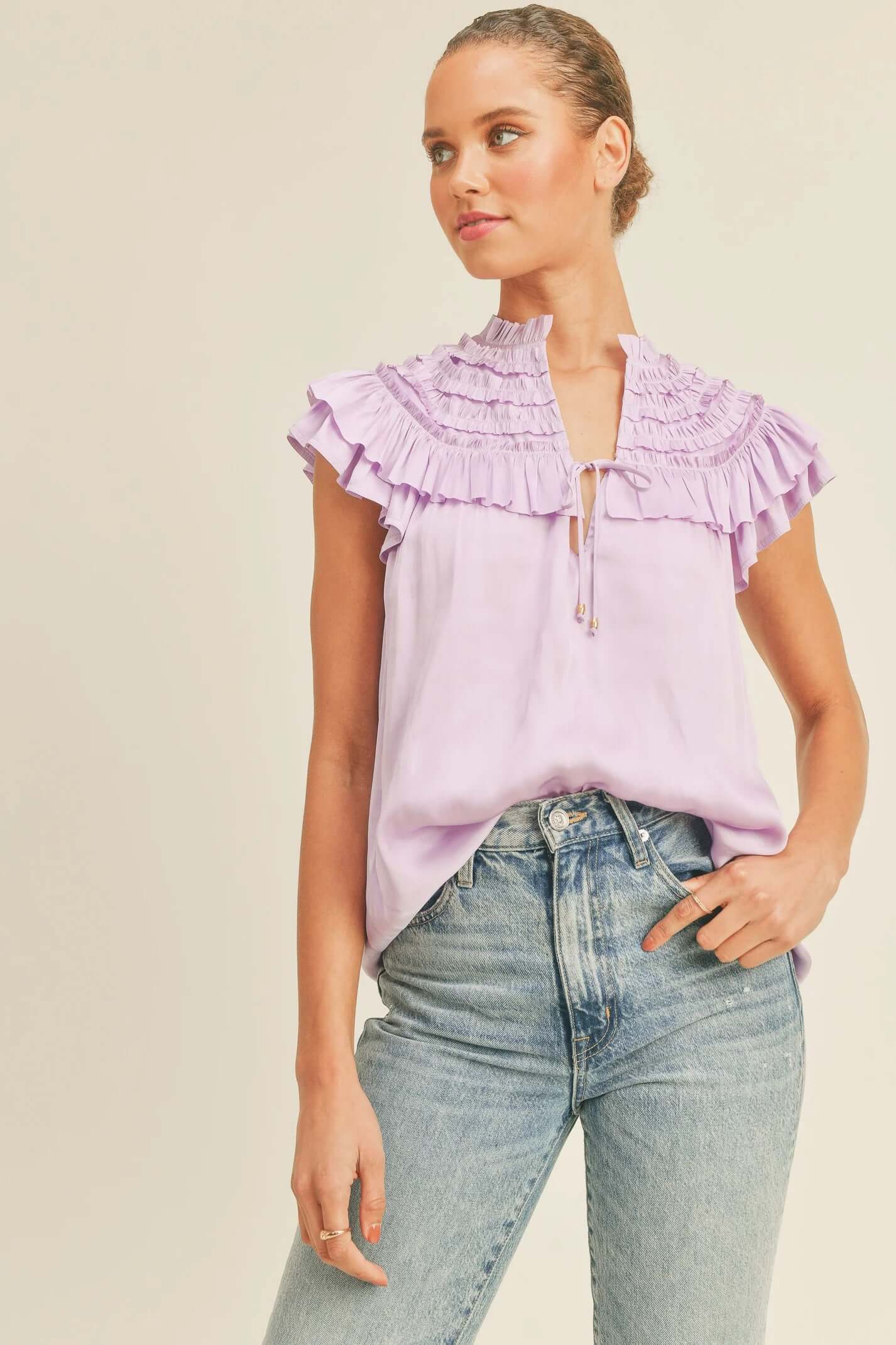 Elevate your style with the Freya Top. Embrace the luxurious feel of the slinky fabric and add a touch of elegance with the ruffle shoulder detail and tie at the neckline. The V-neck and ruffle cap sleeves make for a flattering silhouette. Perfect for any occasion, this short sleeve top will surely become a wardrobe staple.