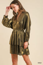 Slip into effortless elegance with this show-stopping surplice V-neck dress that's equal parts glam and comfort. The shimmering gold metallic fabric catches the light beautifully, while cascading tiered layers add movement and dimension. An elastic waistband keeps things relaxed and wearable all day long. Crafted from 100% polyester, this unlined beauty is as practical as it is pretty. Perfect for anyone who wants to turn heads without sacrificing that cozy, carefree vibe.