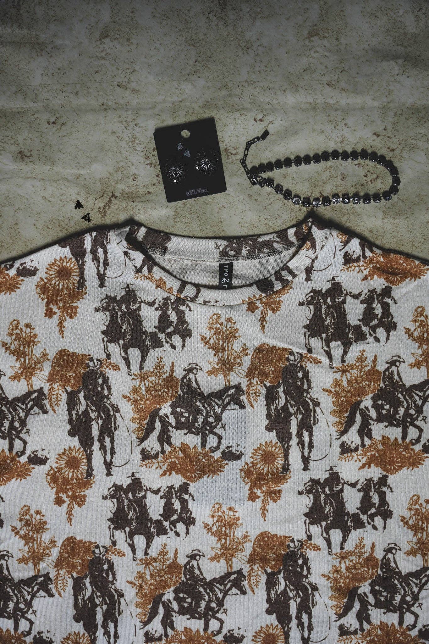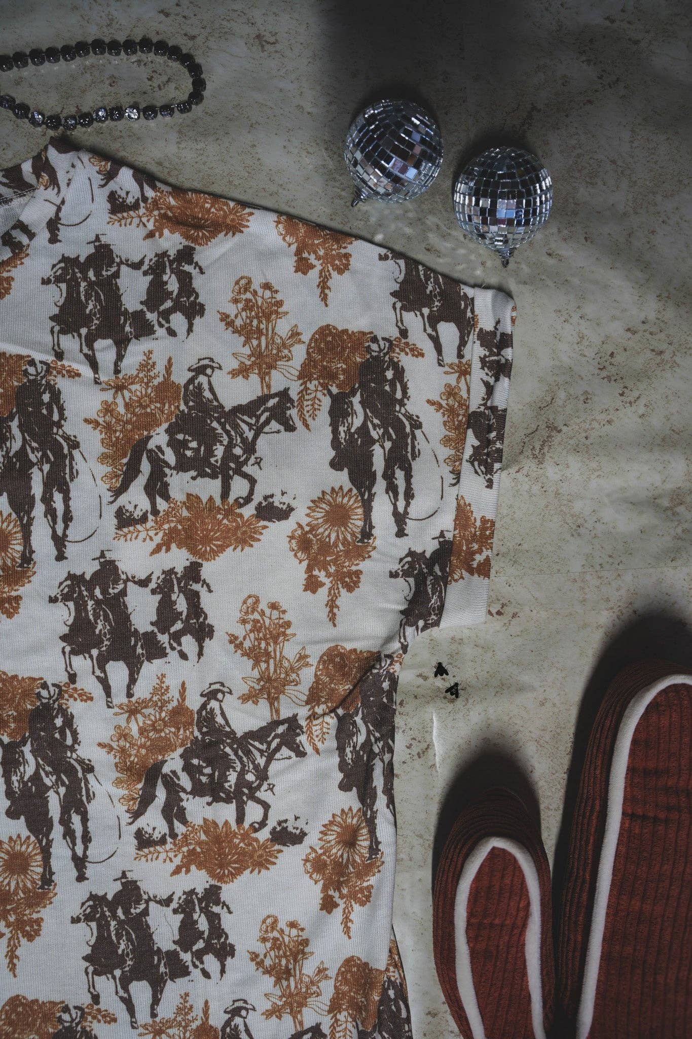 Unleash your inner summer goddess with this Harvest Howdy soft knit Tee! Featuring a gorgeous sunflower design in a spicy mustard hue and a charming western print in classic brown, this short sleeve crew neck top will have you feeling stylish and playful all season long.