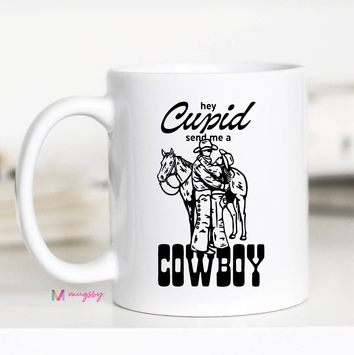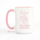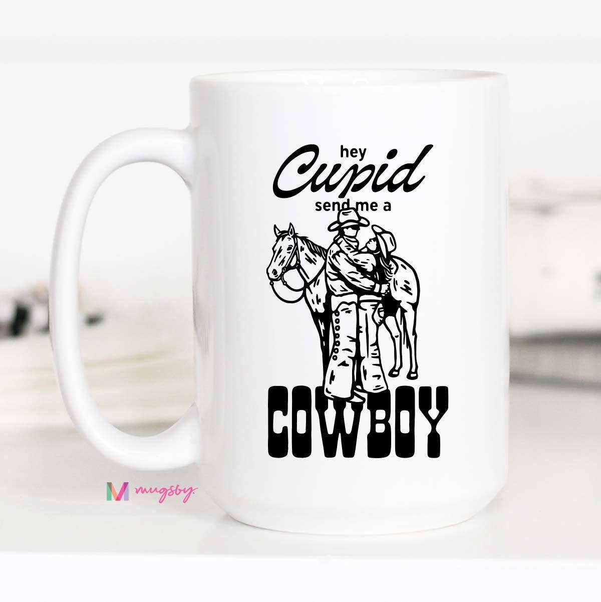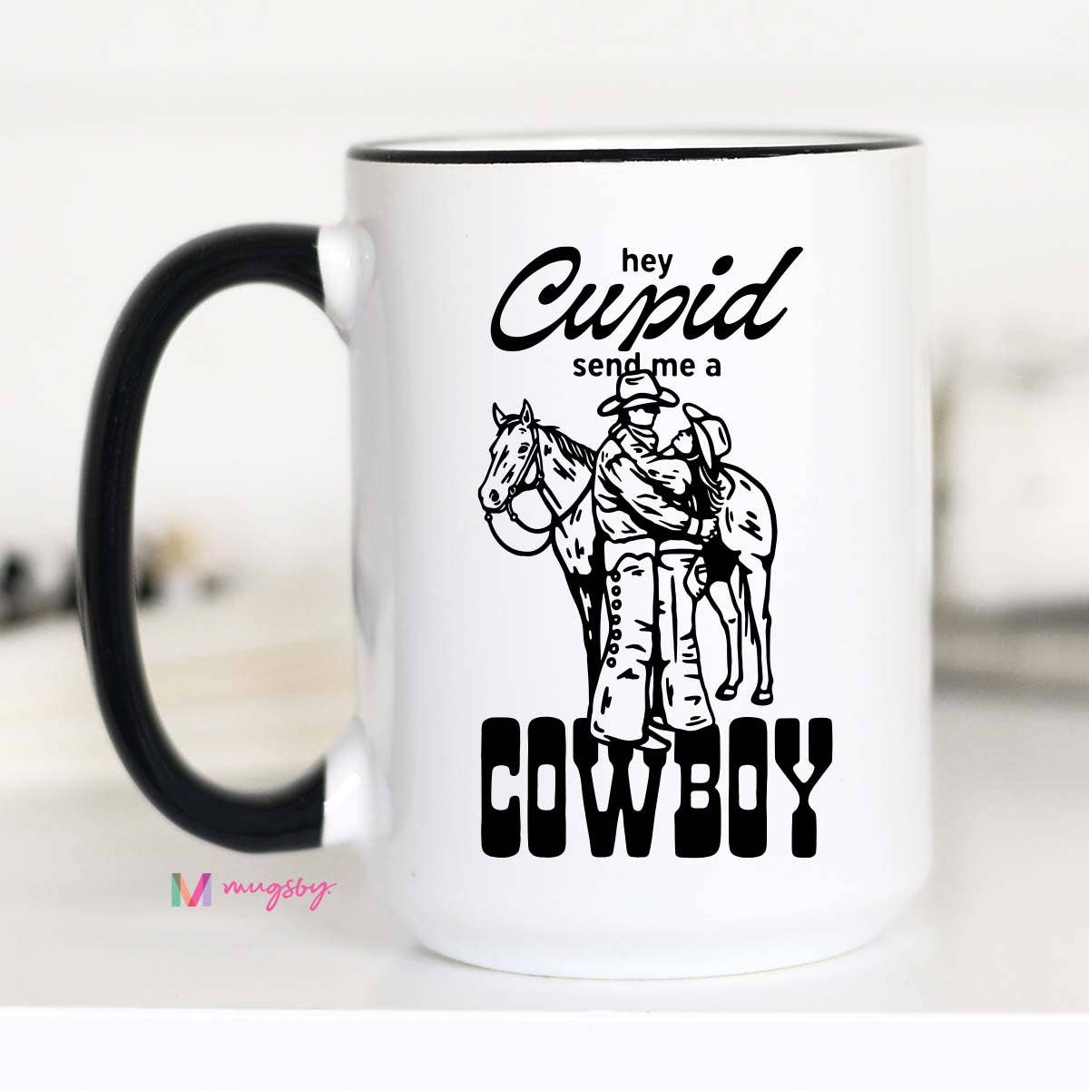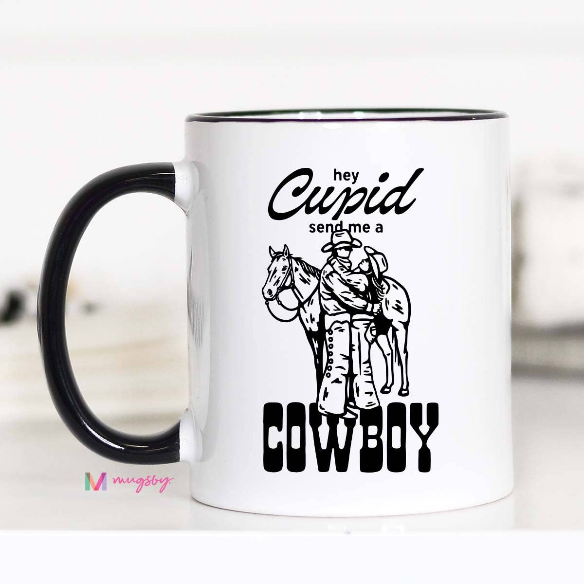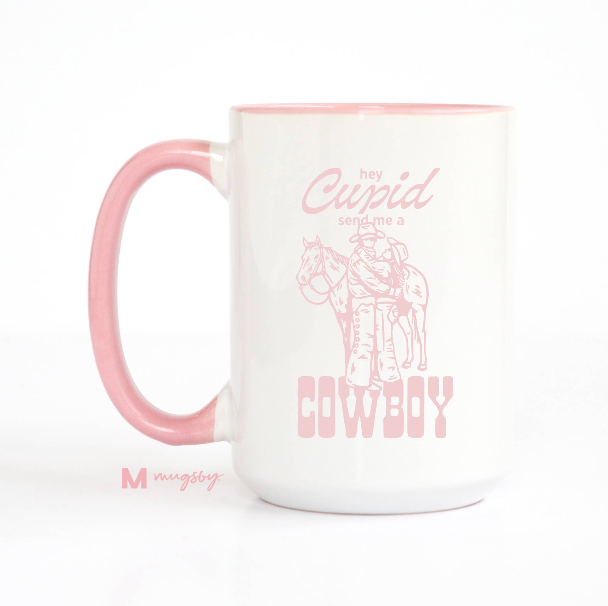 Giddy up, Cupid! This playful Valentine's mug is perfect for anyone with a soft spot for boots, hats, and a little southern charm. Whether you're sipping on your morning coffee, tea, or hot cocoa, this mug will have you dreaming of love on the range. Double sided print. Top rack dishwasher safe. Microwave safe. Made of ceramic. Choose between all white, black rim/handle or pink inner/handle