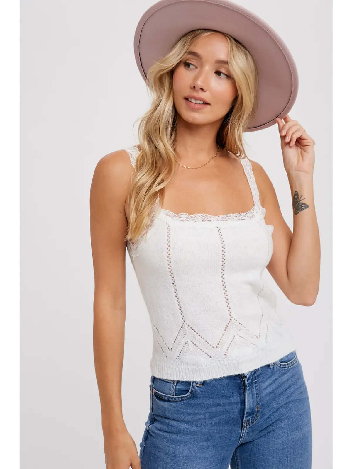 This elegant Cami is defined by its delicate lace straps and neckline that lend it a touch of romantic allure. Covered in a charming eyelet pattern, it effortlessly balances casual style with feminine sophistication. This piece is perfect for layering under your favorite cardigan or blazer, or it can be worn solo on warmer days, making it a versatile addition to any wardrobe.