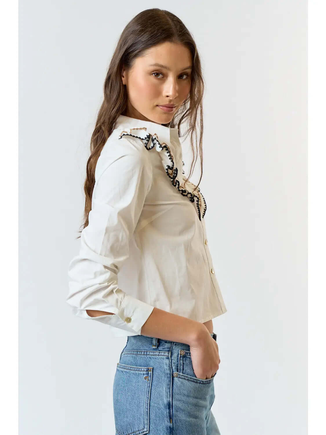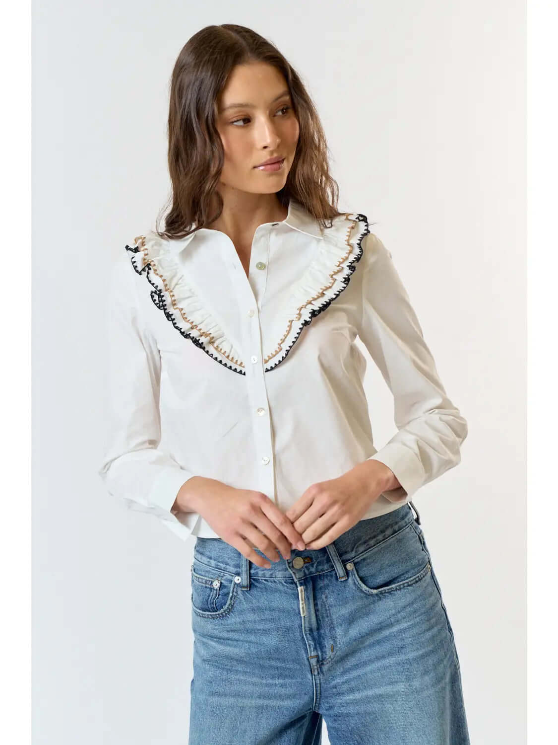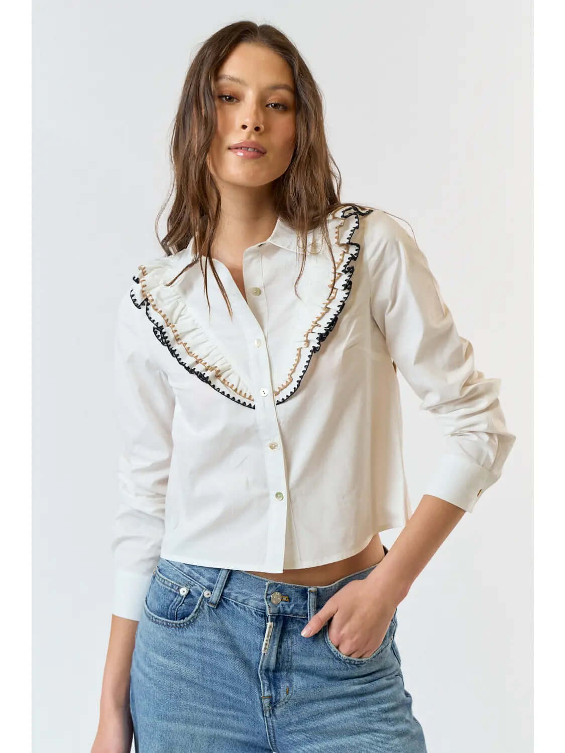 Crisp cotton long sleeve shirt with a ruffle front detail and black and brown embroidery along the edges of the ruffle trim.