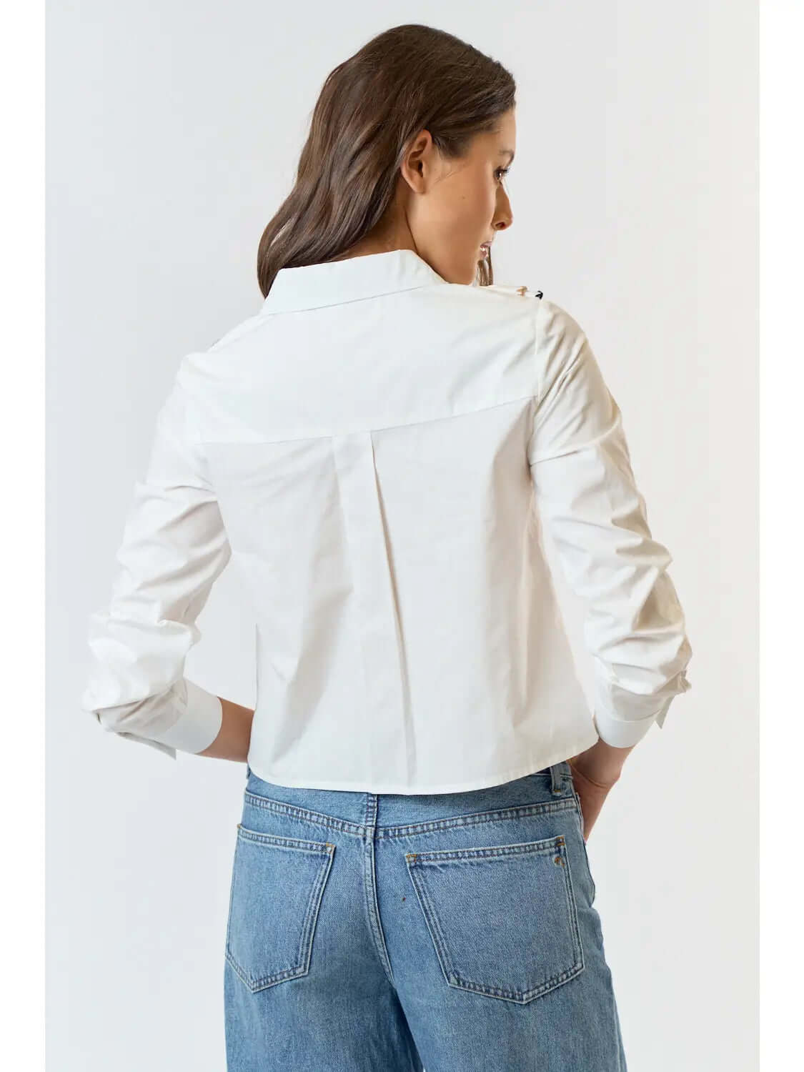 Long Sleeve Collar Button Down Cotton Shirt w/Ruffle and Embroidery Details