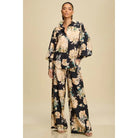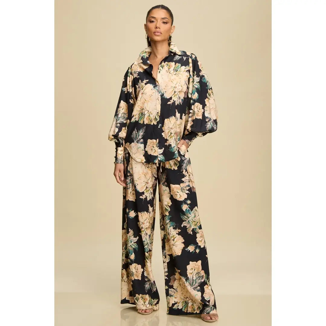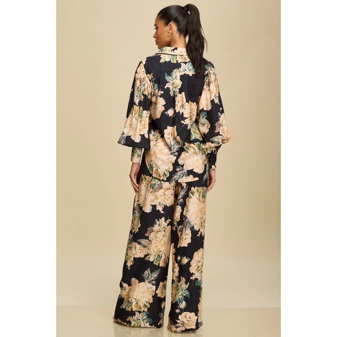 Magnolia Vintage Floral Wide-Leg Pants by Luxxel – Black/Tan/Gold with Blue-Green Accents | Elastic Waist