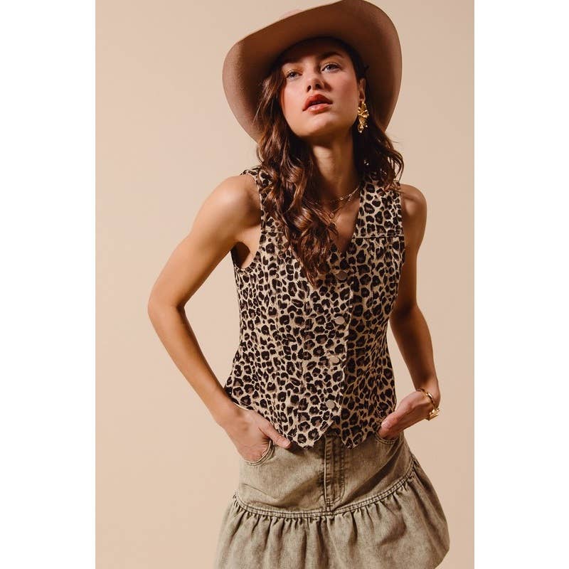The Lioness Vintage Denim Leopard Print Button Up Vest