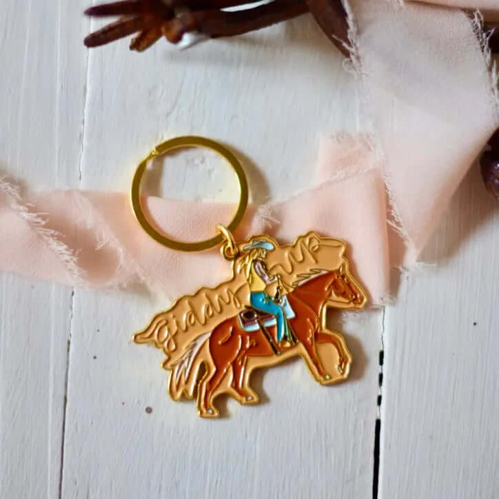 Western Horse Rider Giddy Up Cowgirl Gold Enamel Keychain